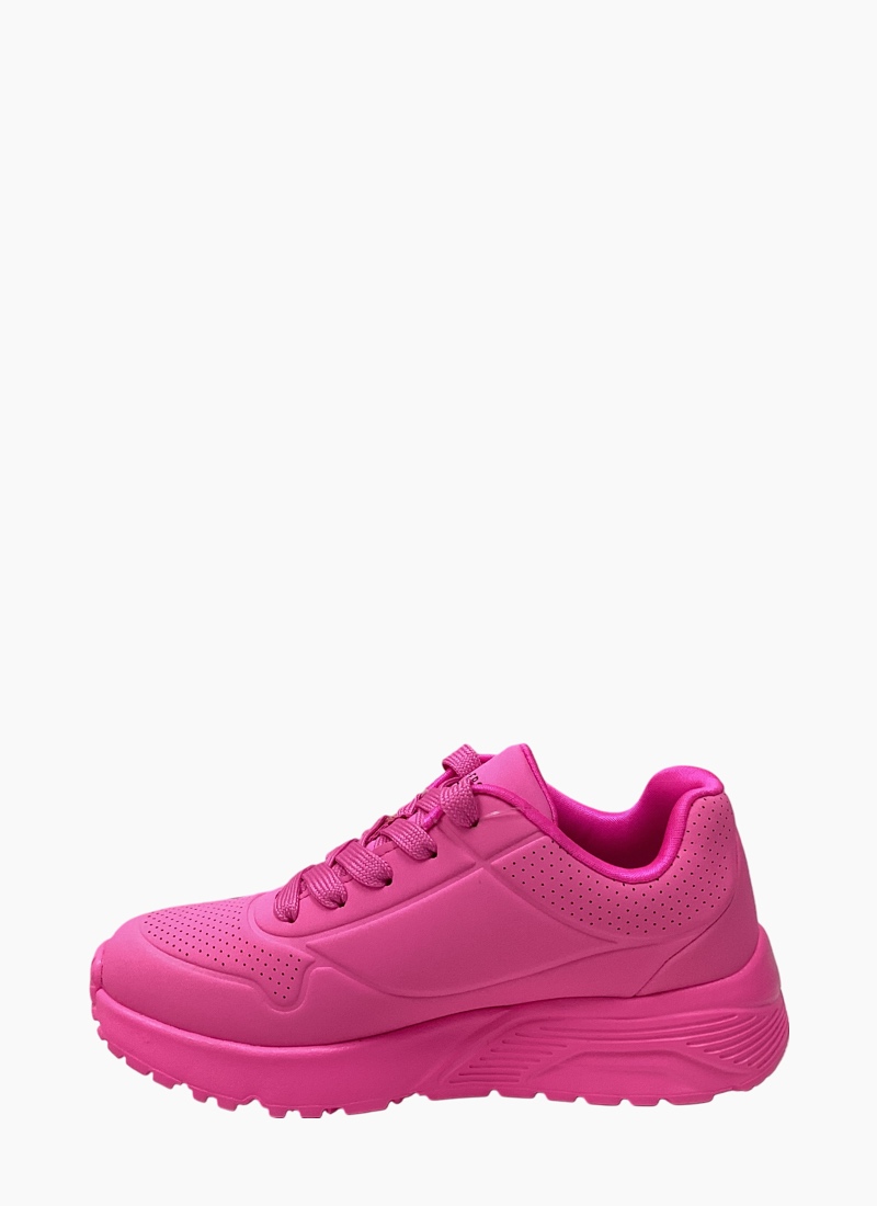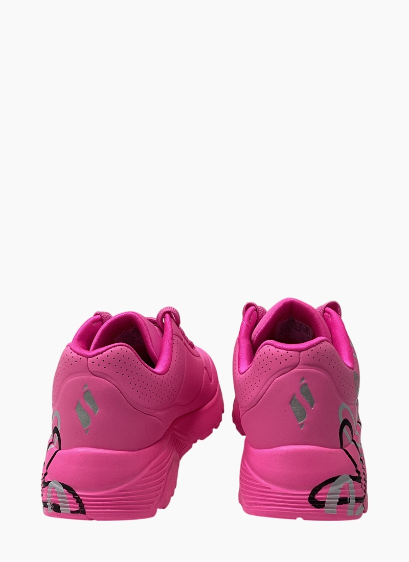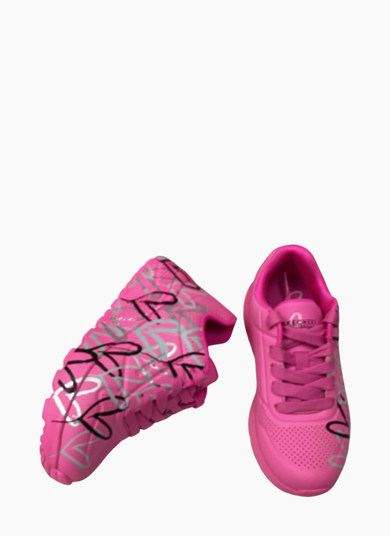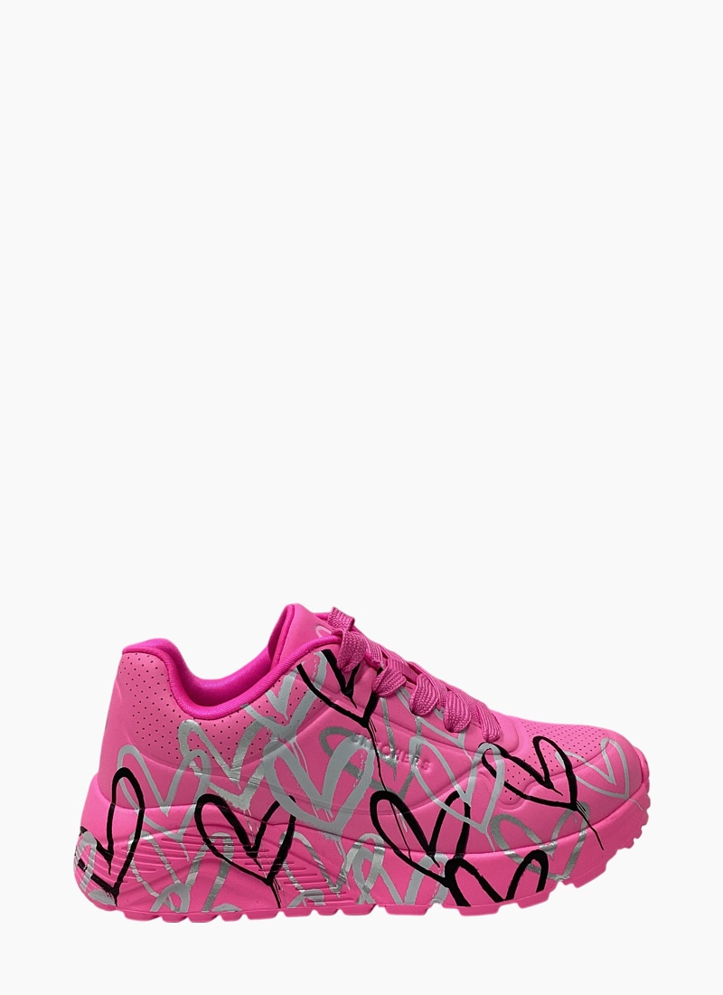 Internationally renowned muralist James Goldcrown brings his iconic #Lovewall heart designs to Skechers in this inspiring collaboration. Show your creative style wearing Skechers Street x JGoldcrown: Uno Lite - Metallic Love. This lace-up fashion sneaker features a metallic print of the artist's signature graffiti heart design that extends to the midsole, a synthetic durabuck and perforated trim upper, Skechers Air-Cooled Memory Foam® insole, plus a platform wedge midsole.