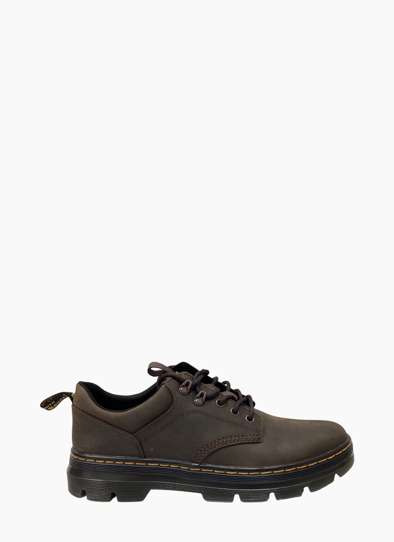 Built for everyday. Standing on an extra rugged luggy outsole and full of Docs DNA. Fitted with hiker style laces and finished with yellow stitching and a black and yellow heel hoop.