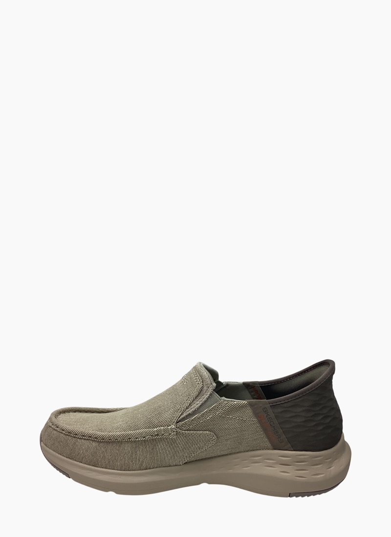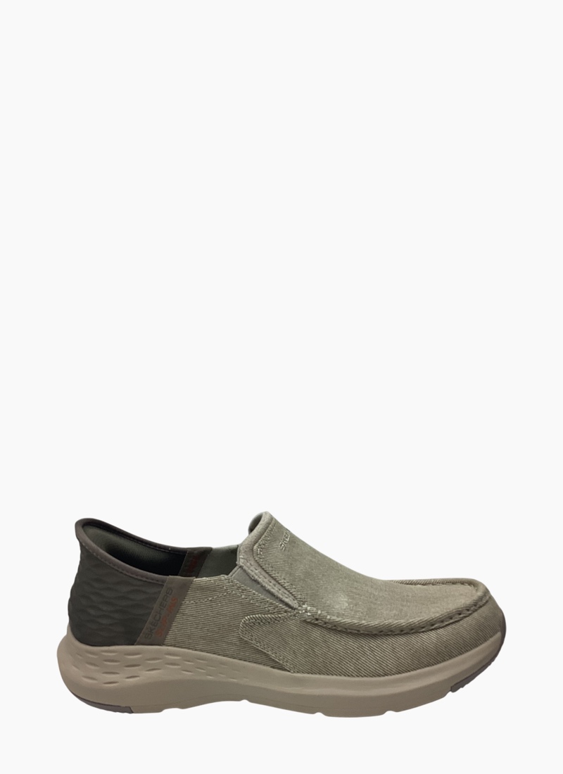 Simply step in and go wearing Skechers Hands Free Slip-ins® Relaxed Fit®: Parson Dewitt. Designed with our Heel Pillow®. This laceless style features a canvas upper with twin gore panels for ease of wear, a Skechers Air-Cooled Memory Foam® comfort insole and Goga Mat Arch™ cushioning for added support.
