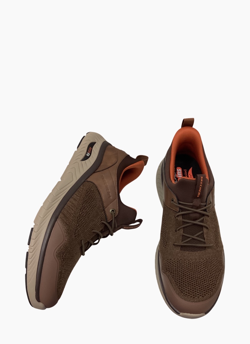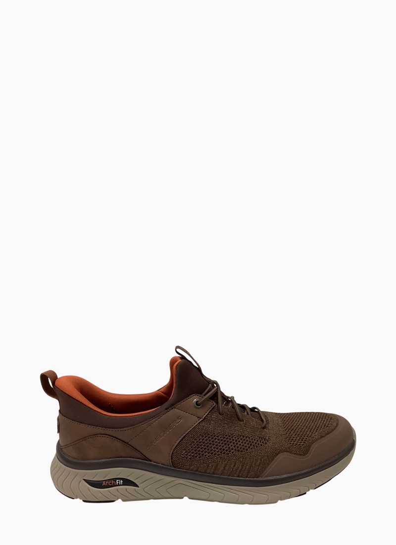 Step into convenient walking comfort with Skechers Slip-ins® Relaxed Fit®: Arch Crosser - Emeric. Designed with our exclusive Heel Pillow™, this stretch-laced style features a knitted and synthetic upper with a removable Skechers Arch Fit® insole.