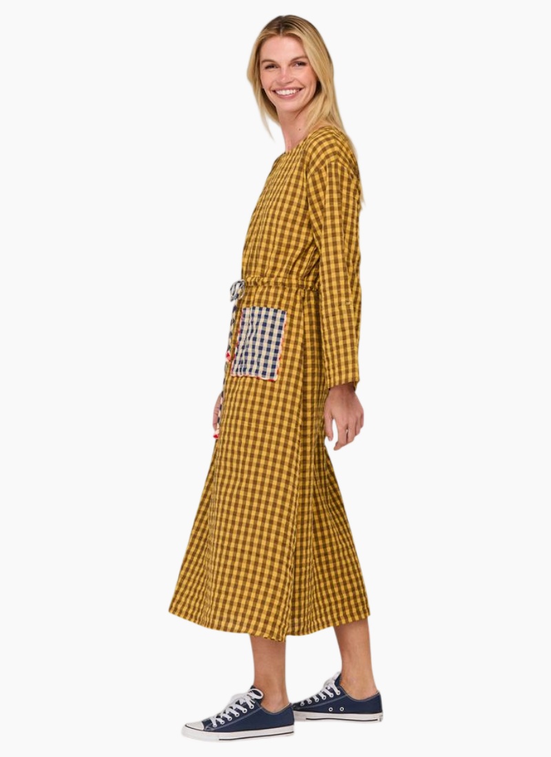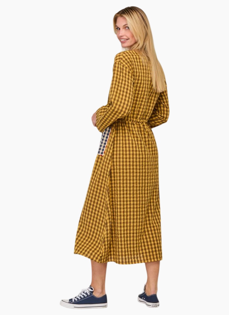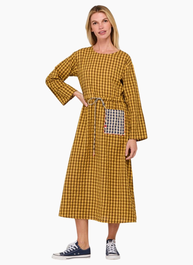 - Mustard Seersucker from Boom Shankar. This relaxed Casual/Day Dress is rendered in a warm mustard gingham and finished in textured cotton seersucker for breathable, everyday wear.