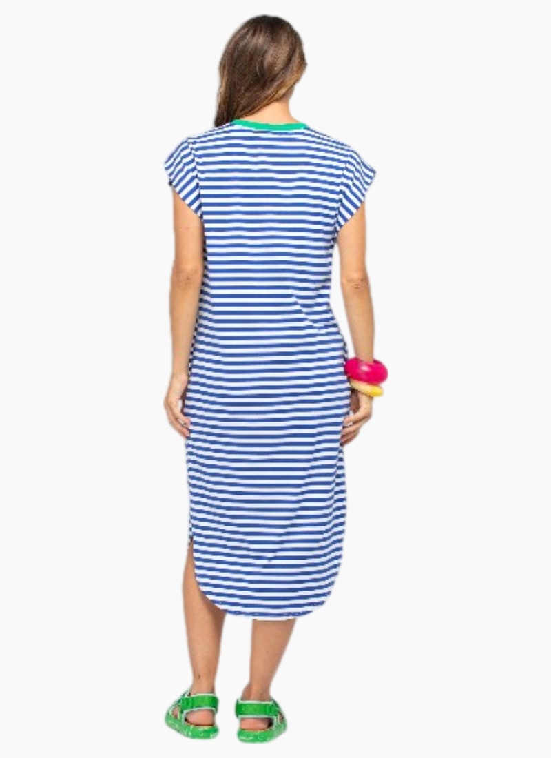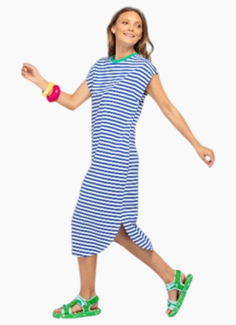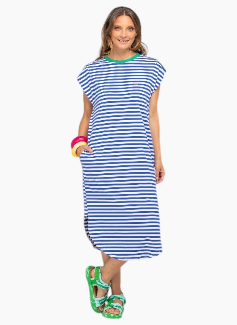 The Boom Shankar Bellissimo Dress is a colourful take on your classic t-shirt dress. Cerulean blue meets crisp white stripes in a fresh and fun design with contrast SMILE embroidery.100% cotton, round neck, contrast neck band, curved hem, inseam side pockets, below knee length, contrast SMILE embroidery, cap sleeve with side panel.