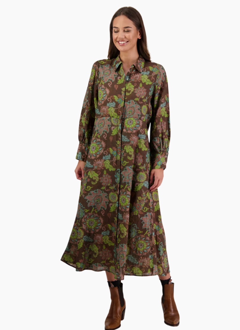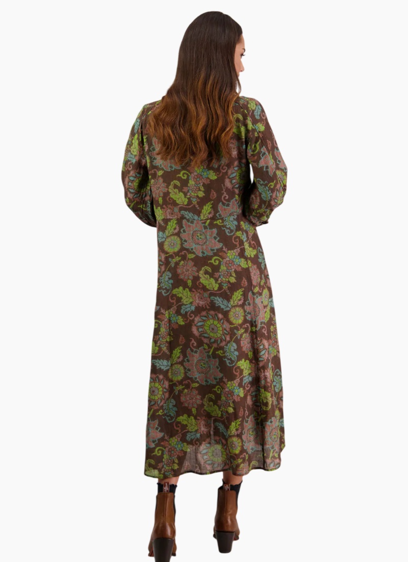 Introducing the Briarwood Hollie Dress Brown Floral. This flowing maxi dress brings vintage-inspired florals and effortless polish to your wardrobe.
