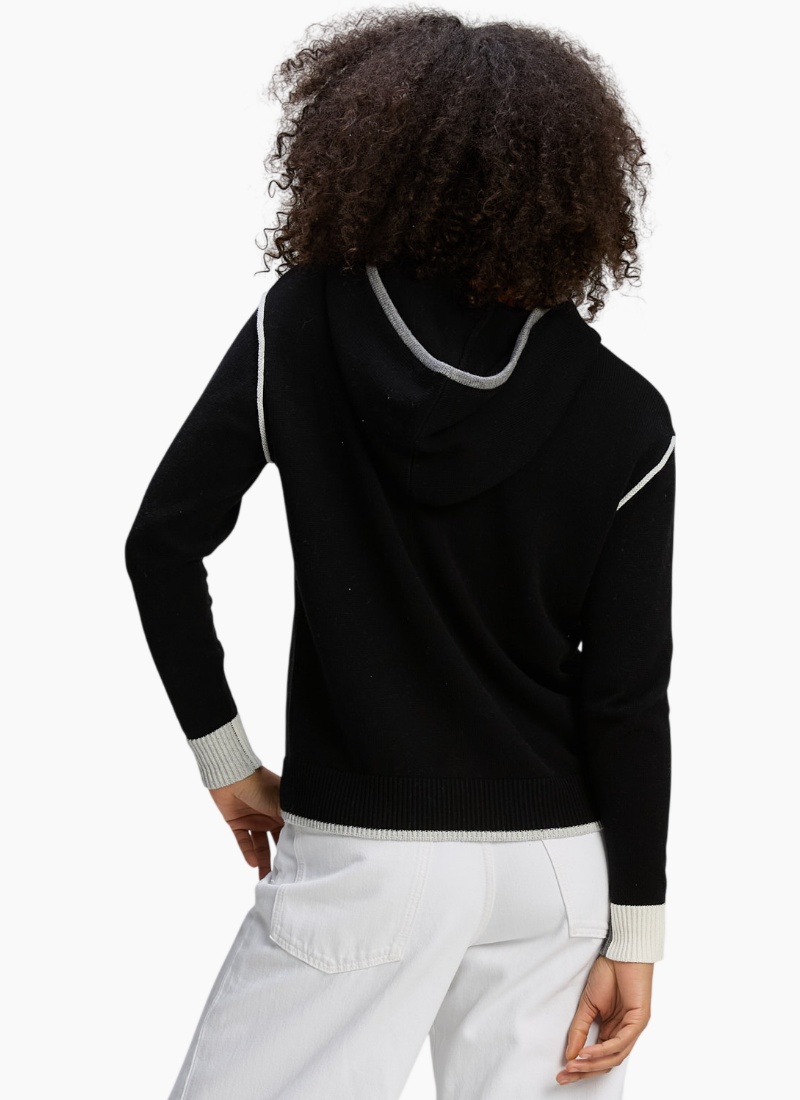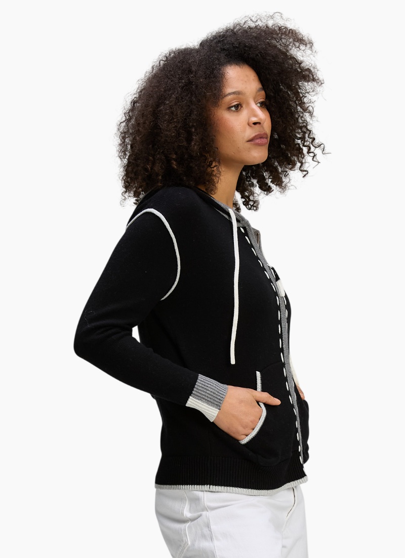 - Zip-front hoodie in classic black colour with contrasting white stitched trim and matching drawcords for a modern, tailored look