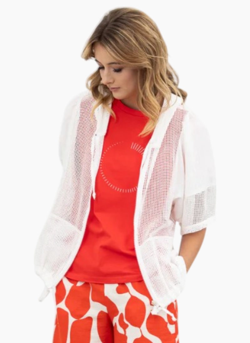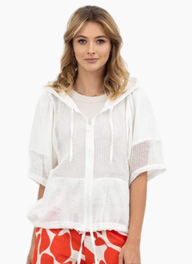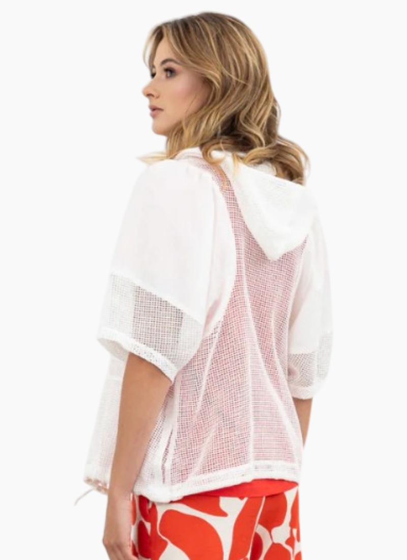 - Contemporary women’s jacket in white with an open-front silhouette, half sleeves and a hood for relaxed layering