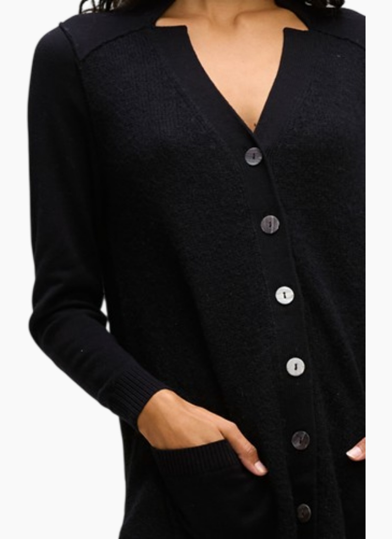 - Classic button-through cardigan in timeless black with two practical front patch pockets