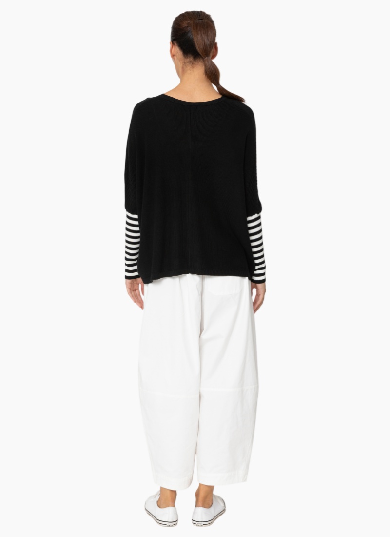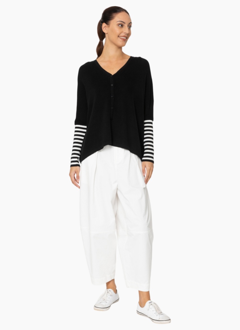 Introducing the Grace Cardigan Black from Two by Two. This relaxed black cardigan offers an effortless, modern layer with distinctive striped sleeve detail.