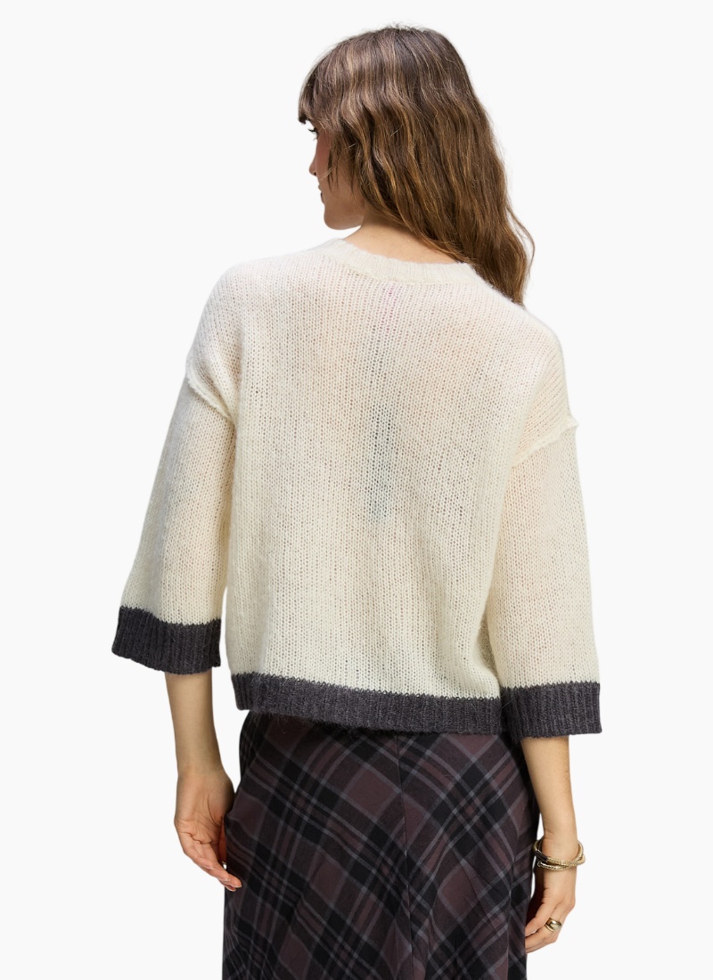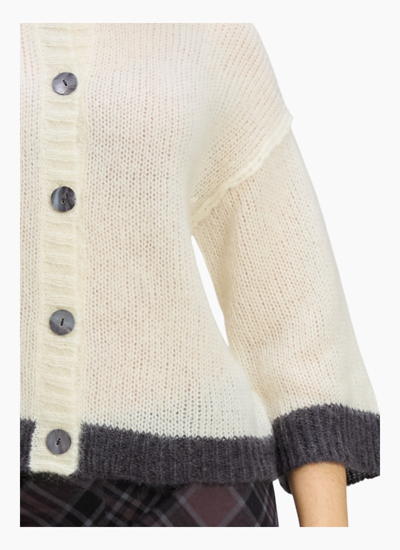 • this winter white cardigan is trimmed with contrasting charcoal rib at the cuffs and hem