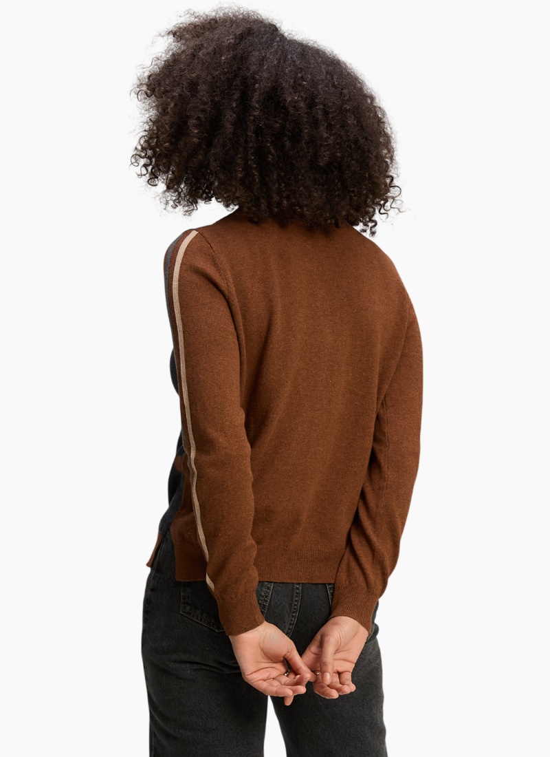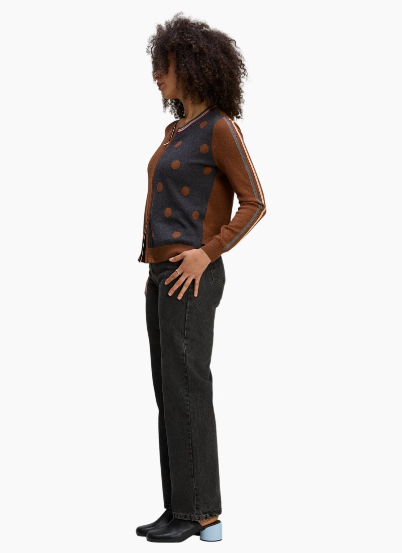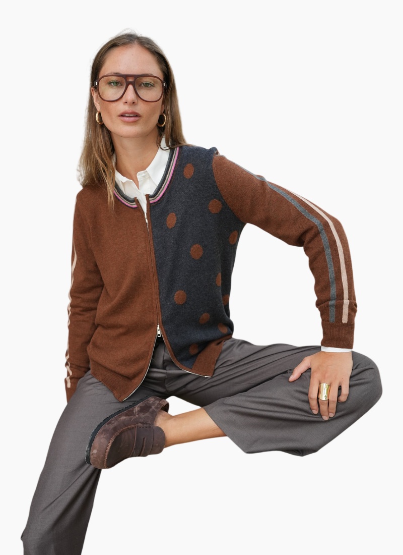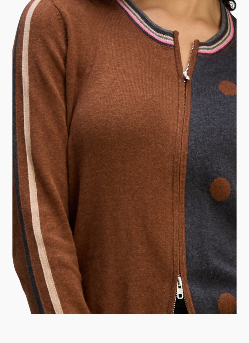 Introducing the Stripe spot Zip up Cardi Coffee from Zaket & Plover. This statement cardi pairs playful polka dots with sporty stripe detailing in a warm coffee and charcoal palette.