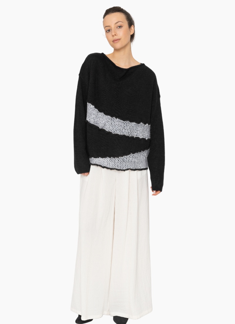 • Deep black base with contrasting white open-knit bands for subtle graphic detail and modern colour contrast
