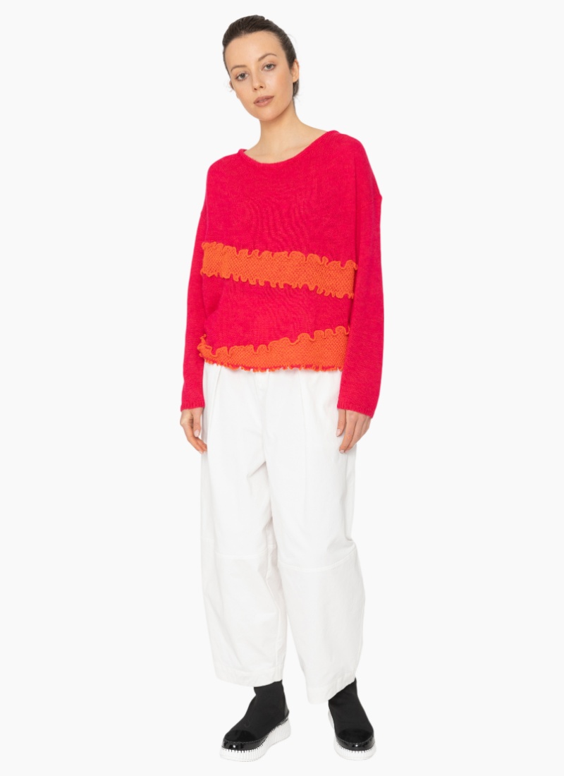 - Bright hot pink body with contrasting orange ruffle stripes for sculptural, feminine detail