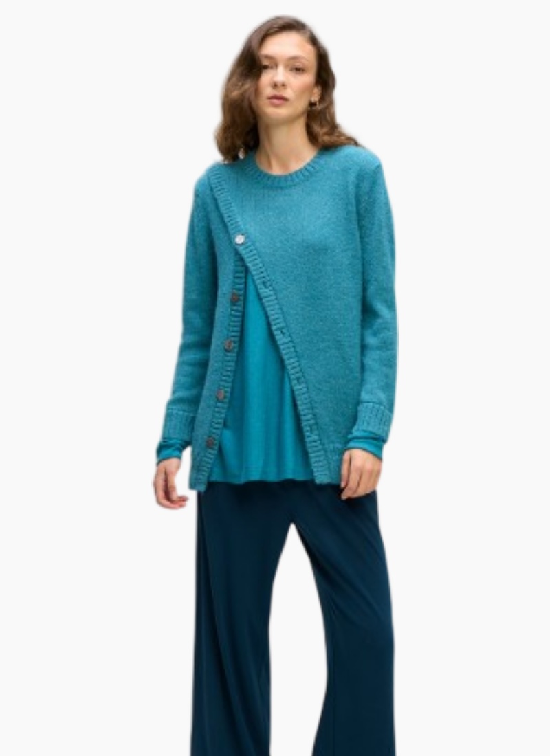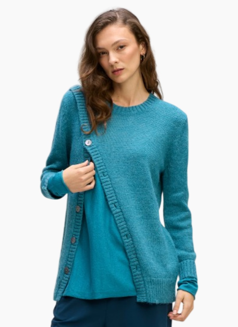 - Asymmetric button detailing along the front adds subtle, modern interest