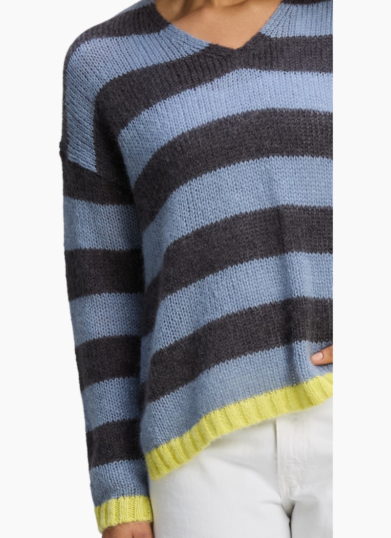 Introducing the Cozy Kid Stripe V Jumper Mist from Zaket & Plover. This jumper delivers cosy, contemporary charm with soft light-blue and charcoal stripes finished with a contrasting yellow hem.