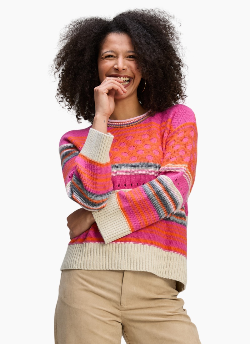 • Bold amaranth pink and orange stripe colourway with contrasting ribbed cuffs and hem