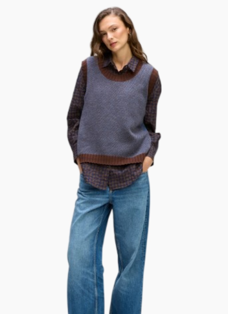 - A versatile women's vest finished in a denim blue colour with contrasting brown trim