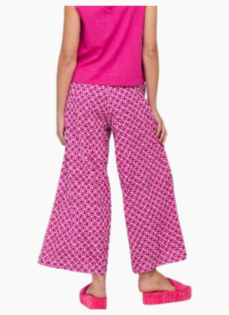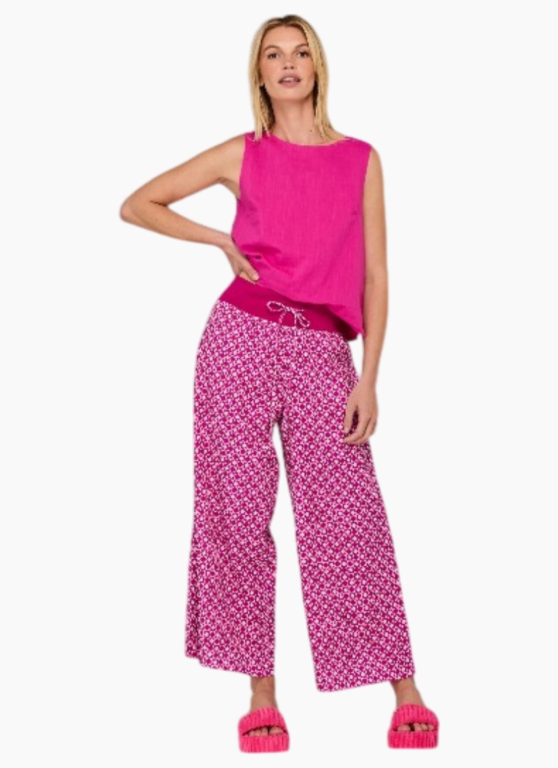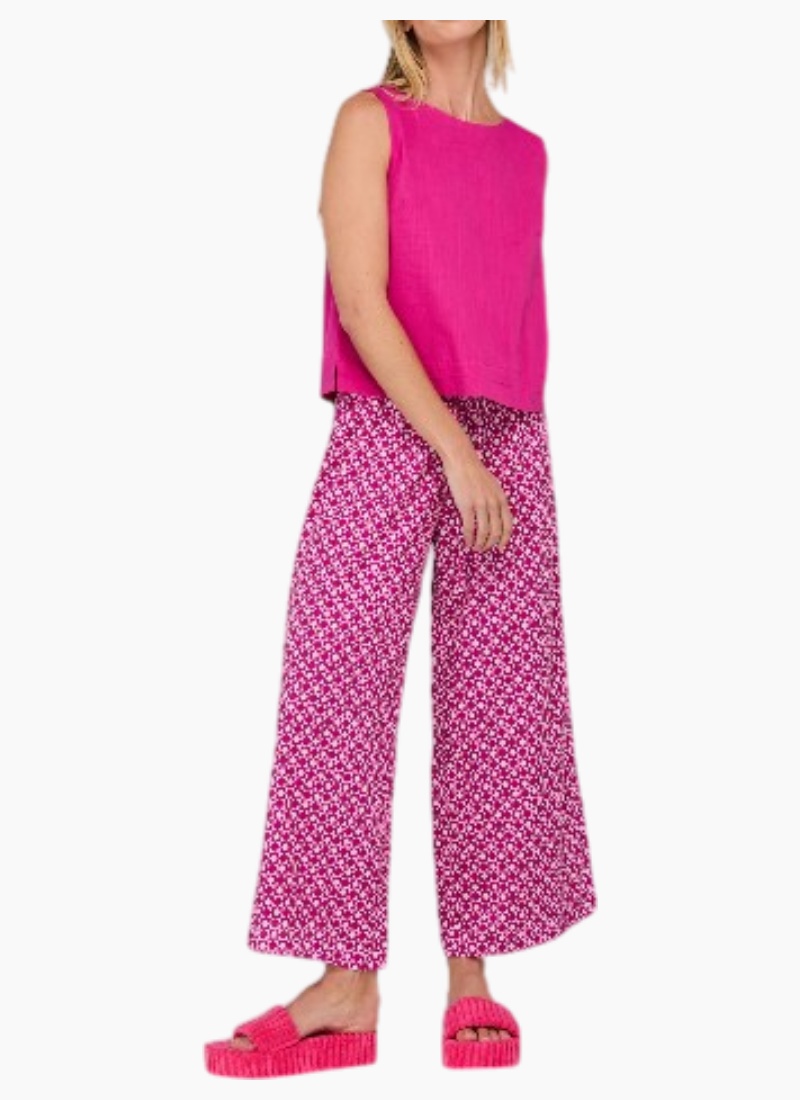 The Boom Shankar Ria Pant is a super comfortable wide-leg pant making them the perfect easy-to-wear option for all shapes and sizes. 100% cotton, ankle-length, wide-leg, stretch rib waistband with fabric drawcord. Fit notes: True to size. It has a fitted stretch waistband with a fuller loose-fitting leg that sits just above the ankle.