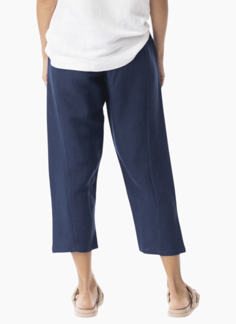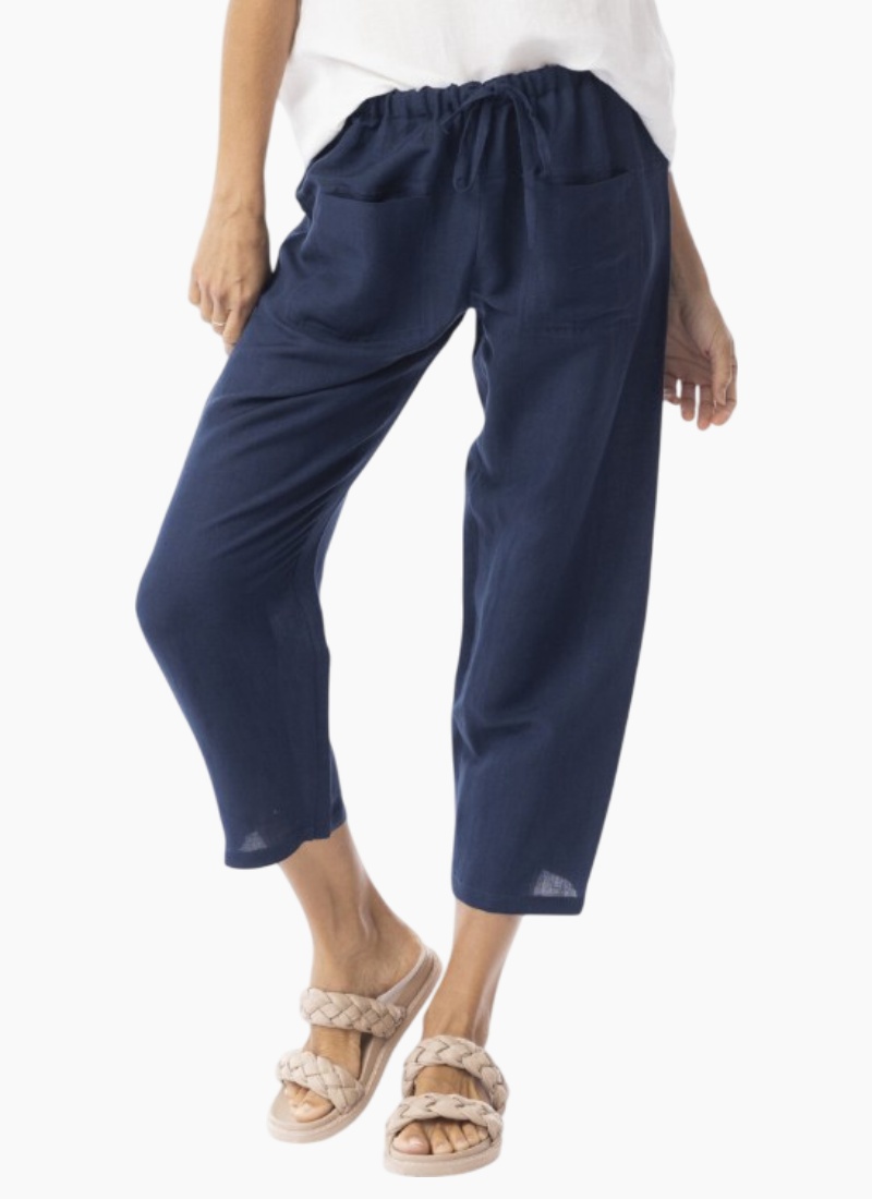 Introducing the Escape Linen Solid Cropped Pant in Navy. These easy-going linen pants bring breathable comfort and relaxed style to your everyday wardrobe.