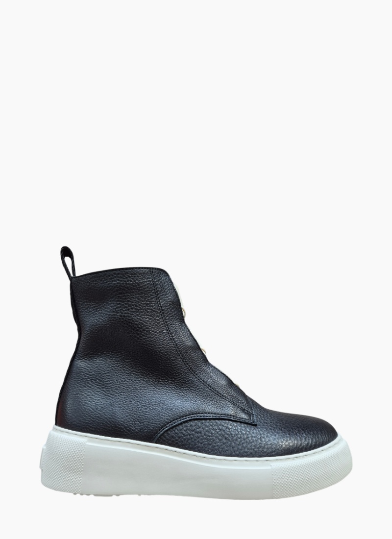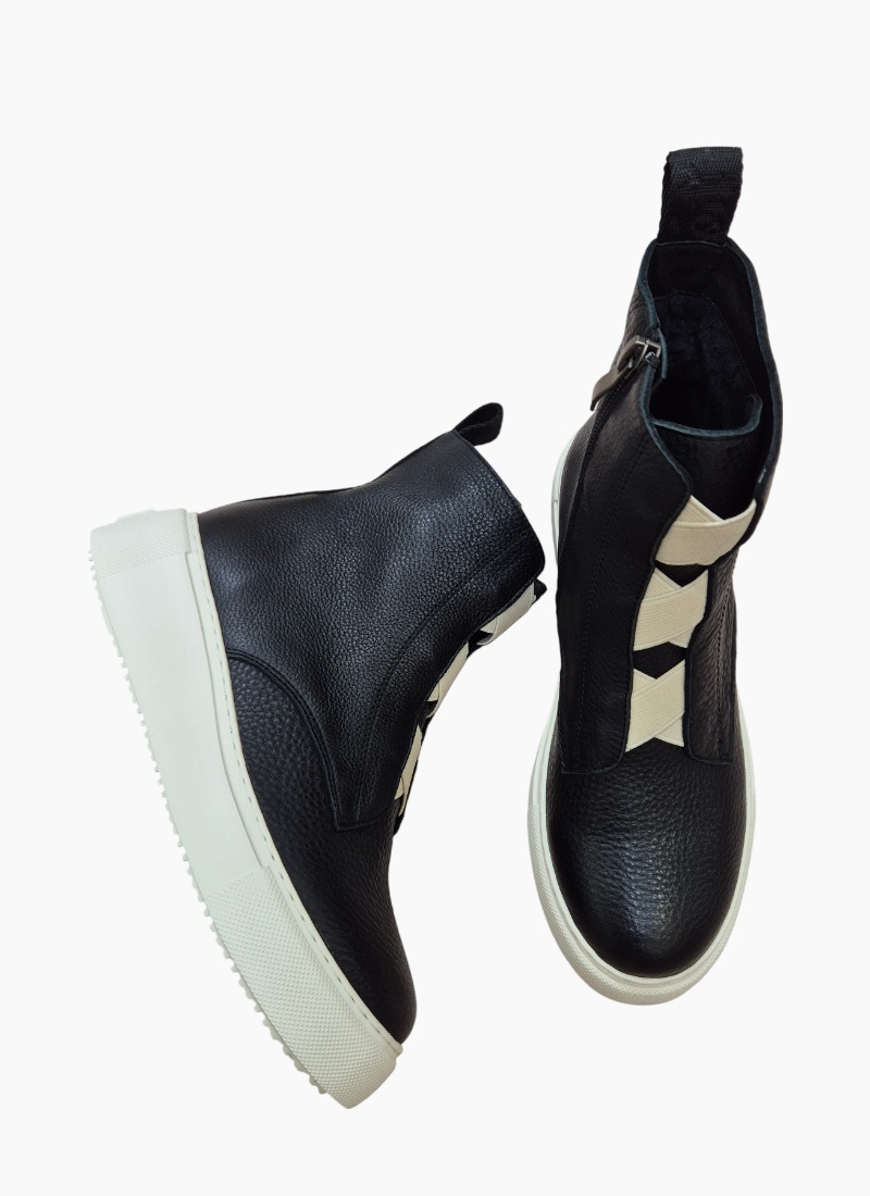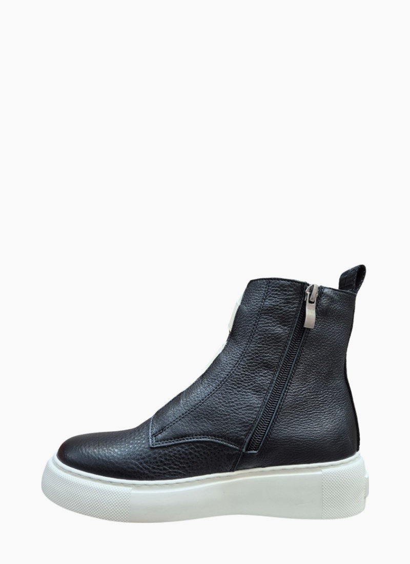 Introducing the Robyn Boot Black from Belle Scarpe. A contemporary ankle boot in black pebbled leather with a striking white platform sole that adds modern edge to everyday outfits.