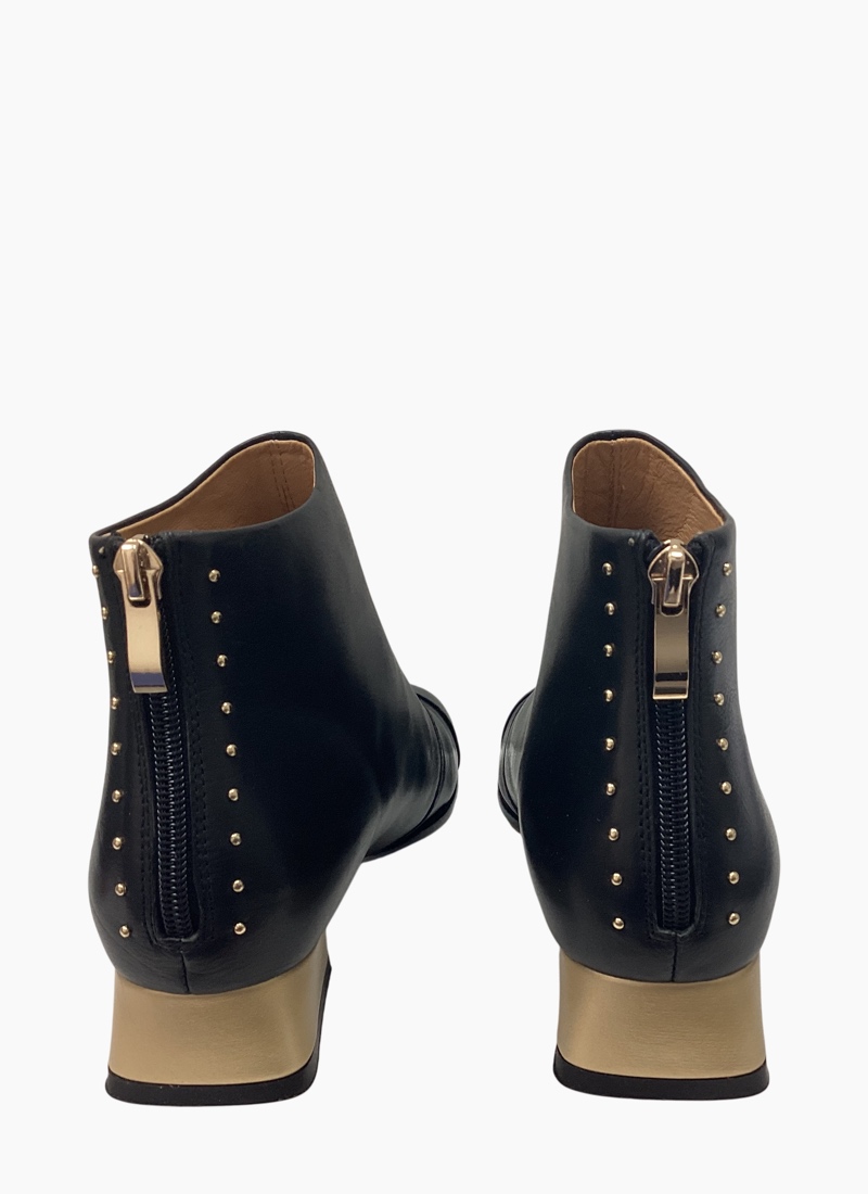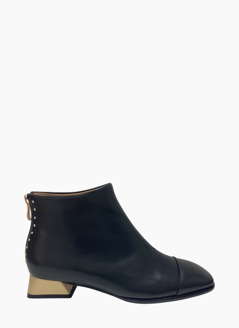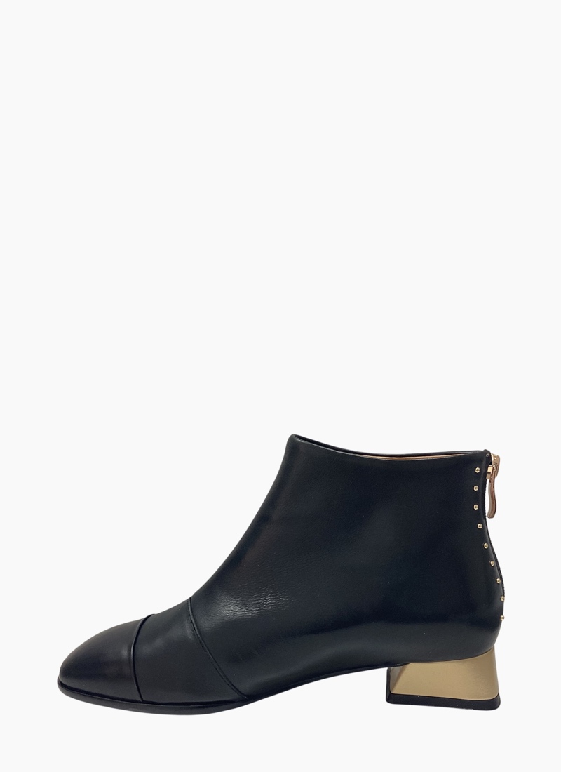 • Low block heel with subtle gold-tone detailing offers a contemporary lift