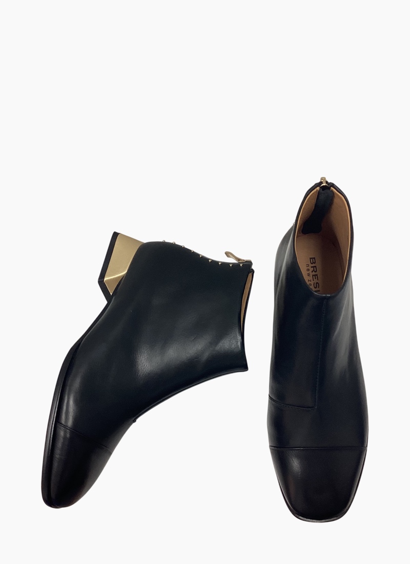 The Bresley Demon ankle boot in black is a stylish statement piece. With its stacked wooden heel and striking metal stud detailing, it adds an edgy touch to any outfit. The rear zip makes it easy to wear, making it perfect for smart-casual looks or your next social event.