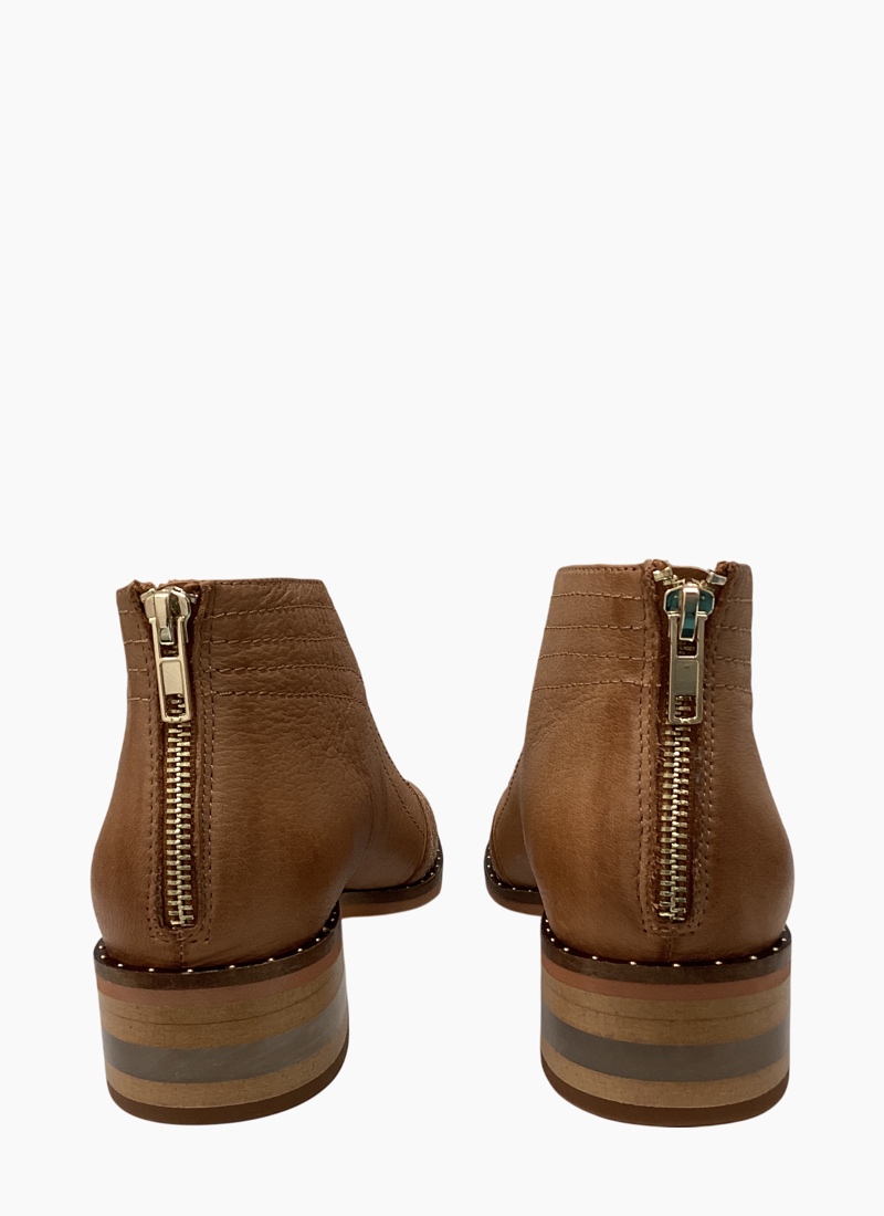 • Low, layered stacked heel and studded welt add subtle western-inspired detailing