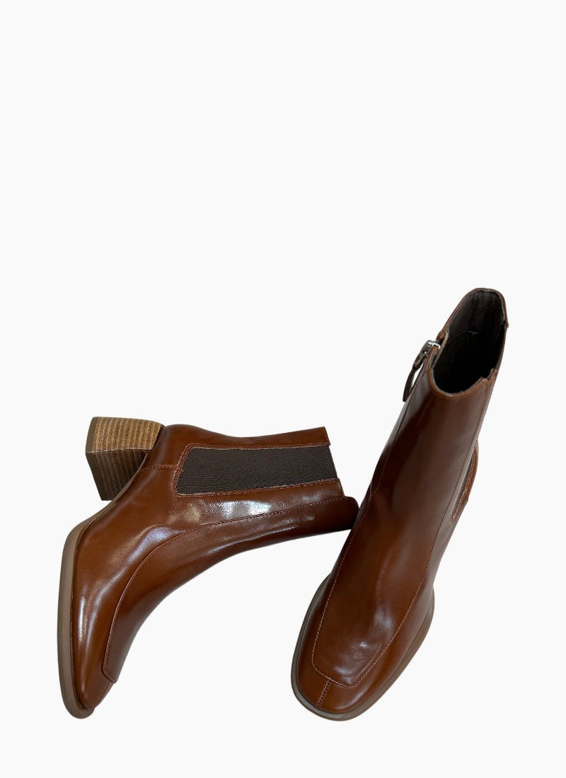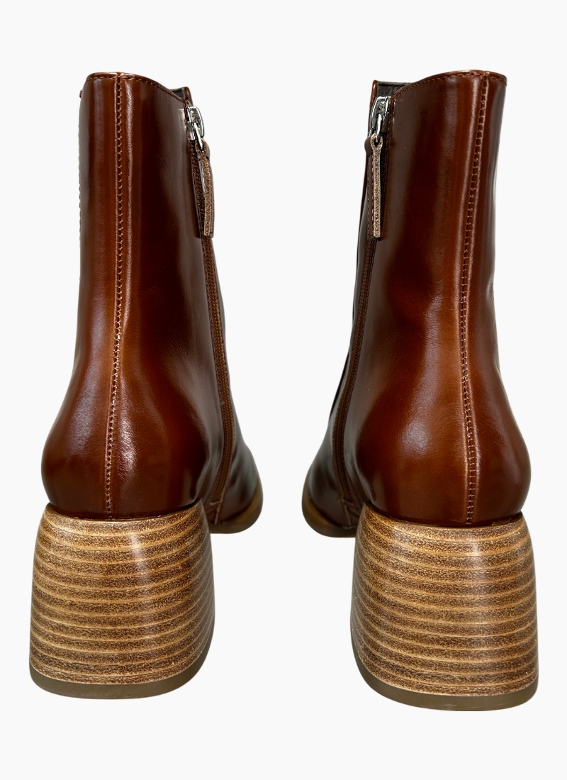 Introducing the Charcoal Ankle Boot Tobacco from EOS. This refined tobacco-coloured ankle boot combines polished leather and a striking stacked heel for a timeless, versatile look.