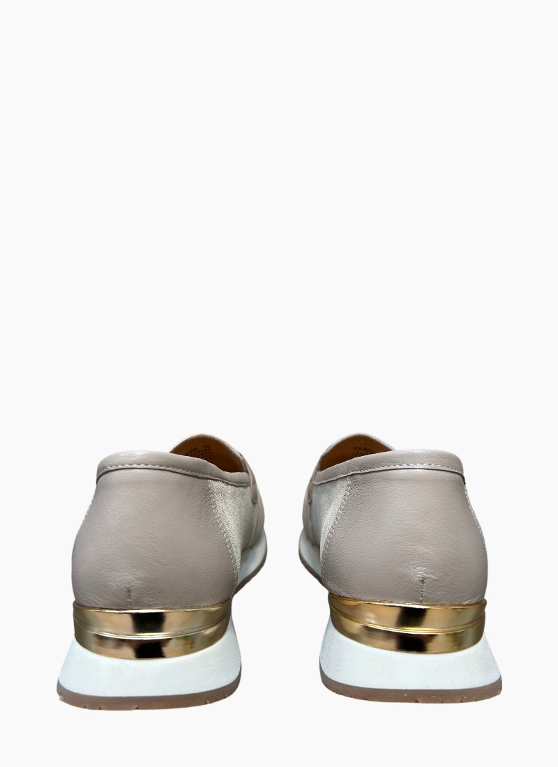 Introducing the Rebekah Loafer from Belle Scarpe. A refined taupe flat that balances classic loafer lines with contemporary sporty details.