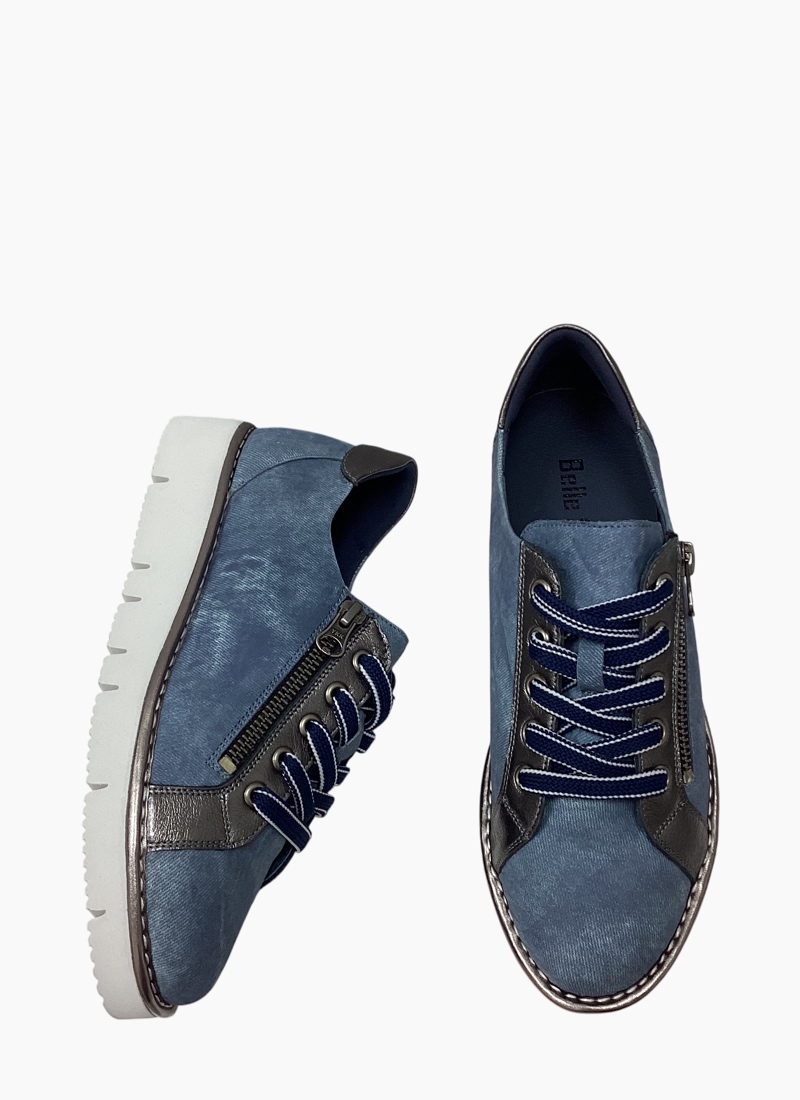 Introducing the Roman Shoe Denim/Pewter from Belle Scarpe. This modern women's sneaker blends casual denim texture with subtle pewter shine for an elevated everyday shoe.