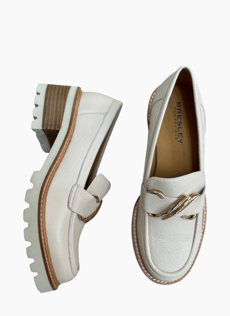Introducing the Dylan Loafer Bone from Bresley. A refined leather loafer in a soft bone colour that elevates everyday dressing with a contemporary stacked-heel detail.