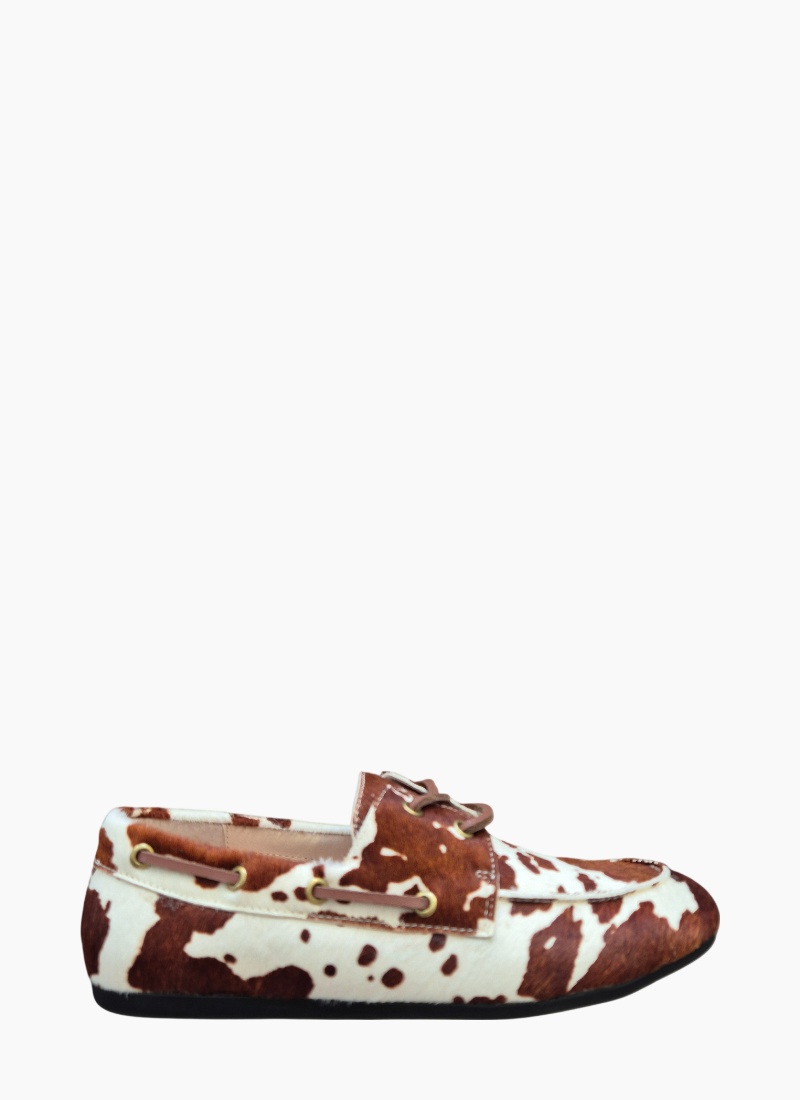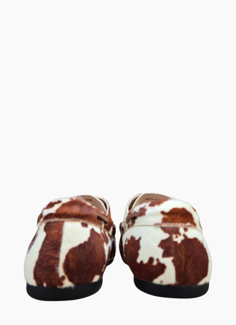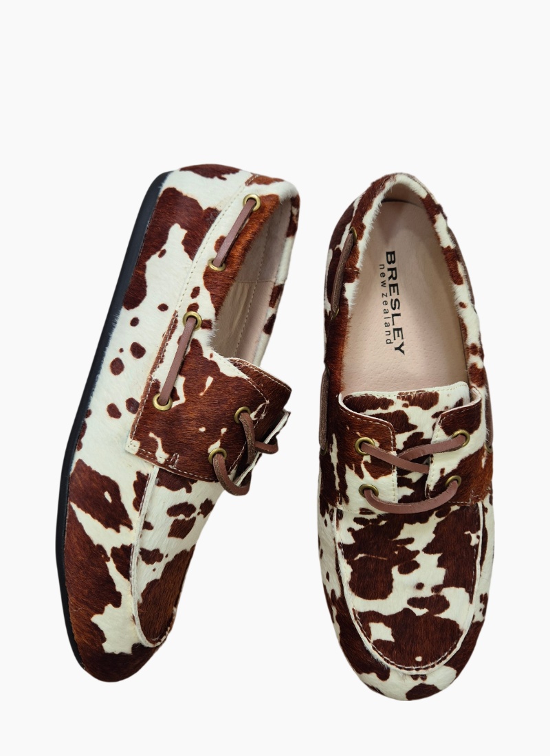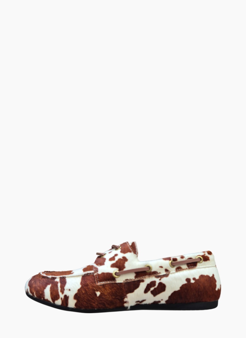Introducing the Sailor Loafer Mid Brown Cow from Bresley. This striking loafer blends classic flat styling with a bold cowhide print for a refined yet playful finish.