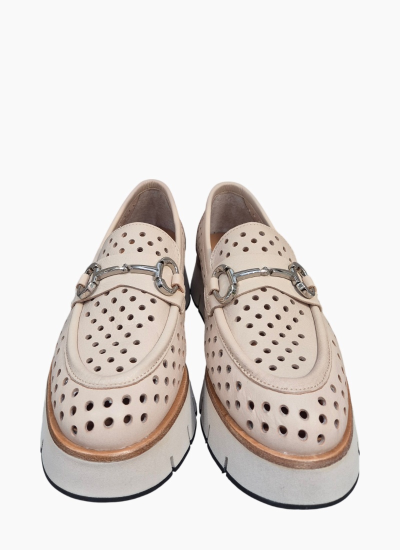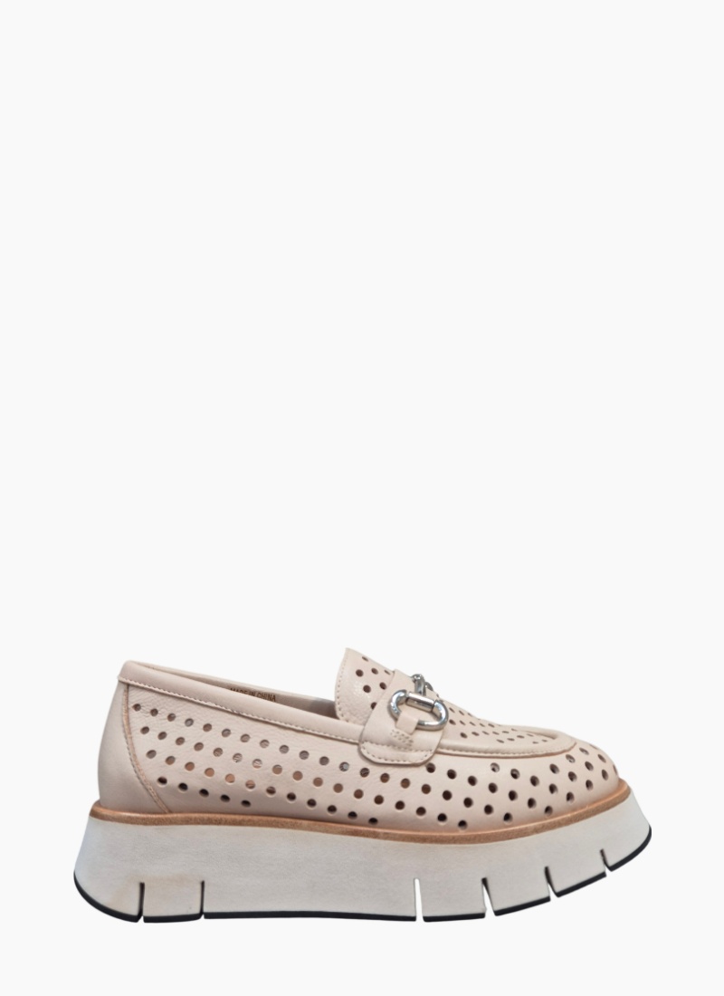 - Neutral-coloured flats with delicate perforated detailing and neat stitch lines