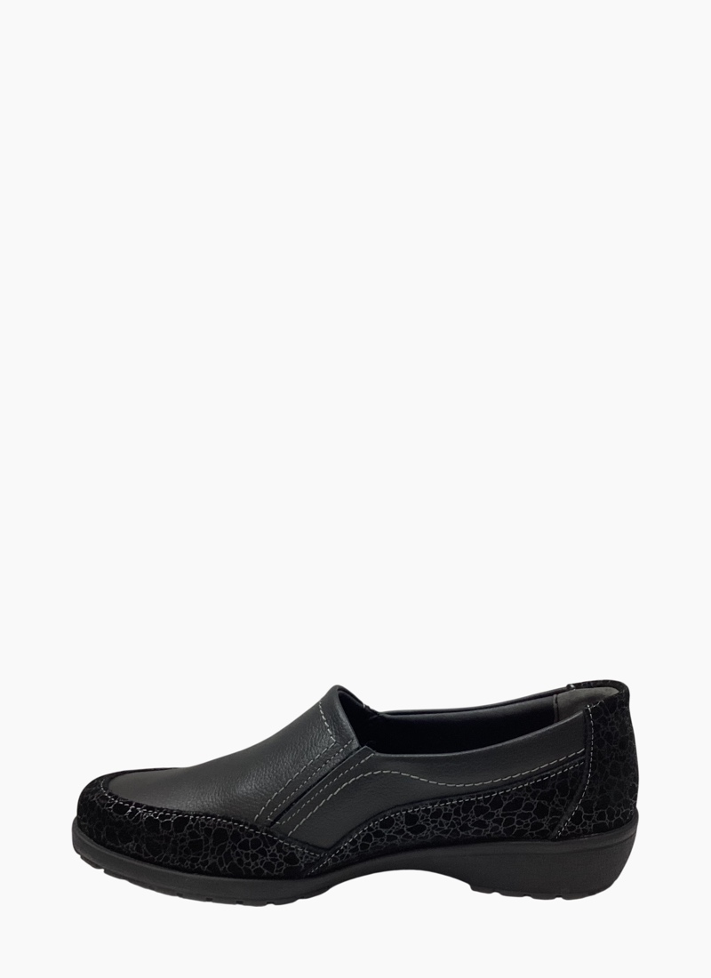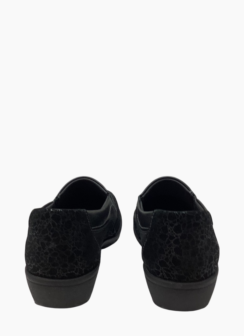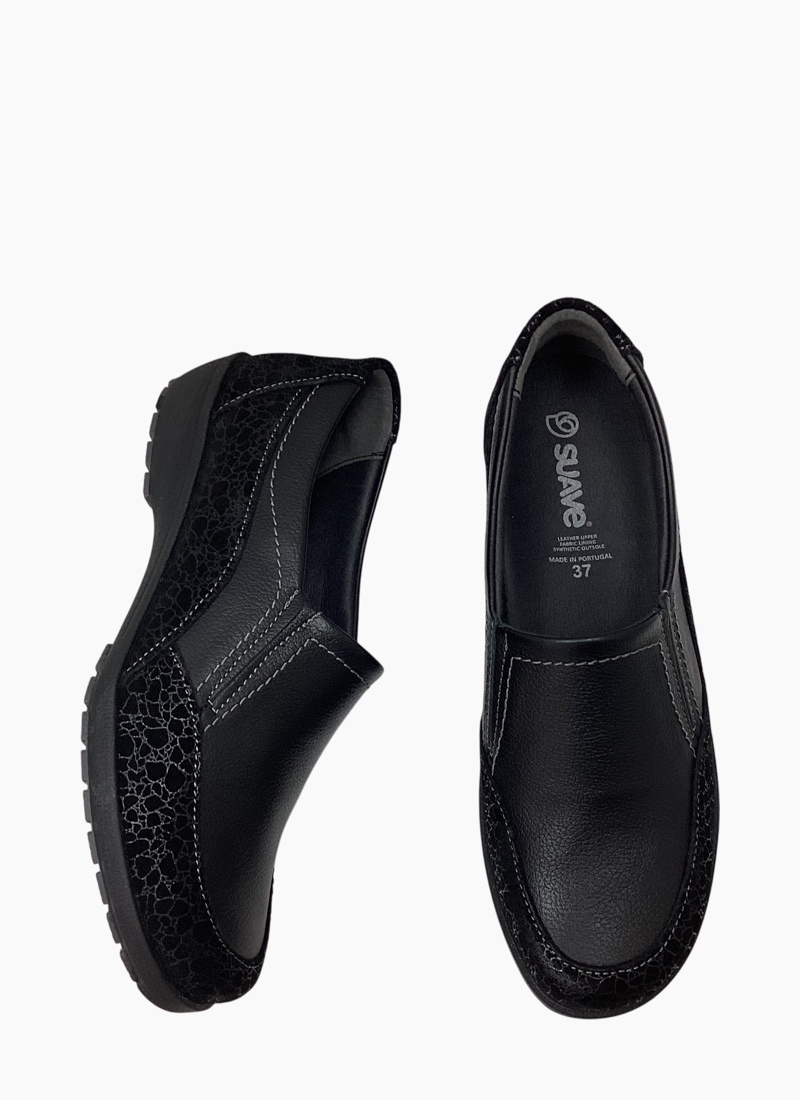 Suave Eldora is a lightweight slip-on packed with personality. A smart, everyday women's flat that pairs classic black leather with a subtle leopard-texture suede panel for refined casual style.