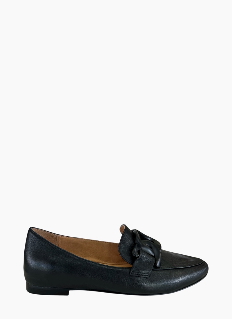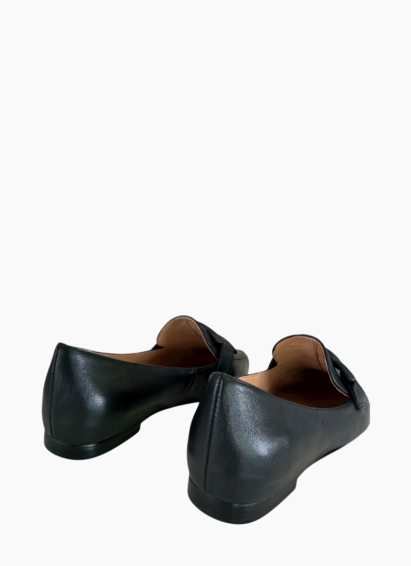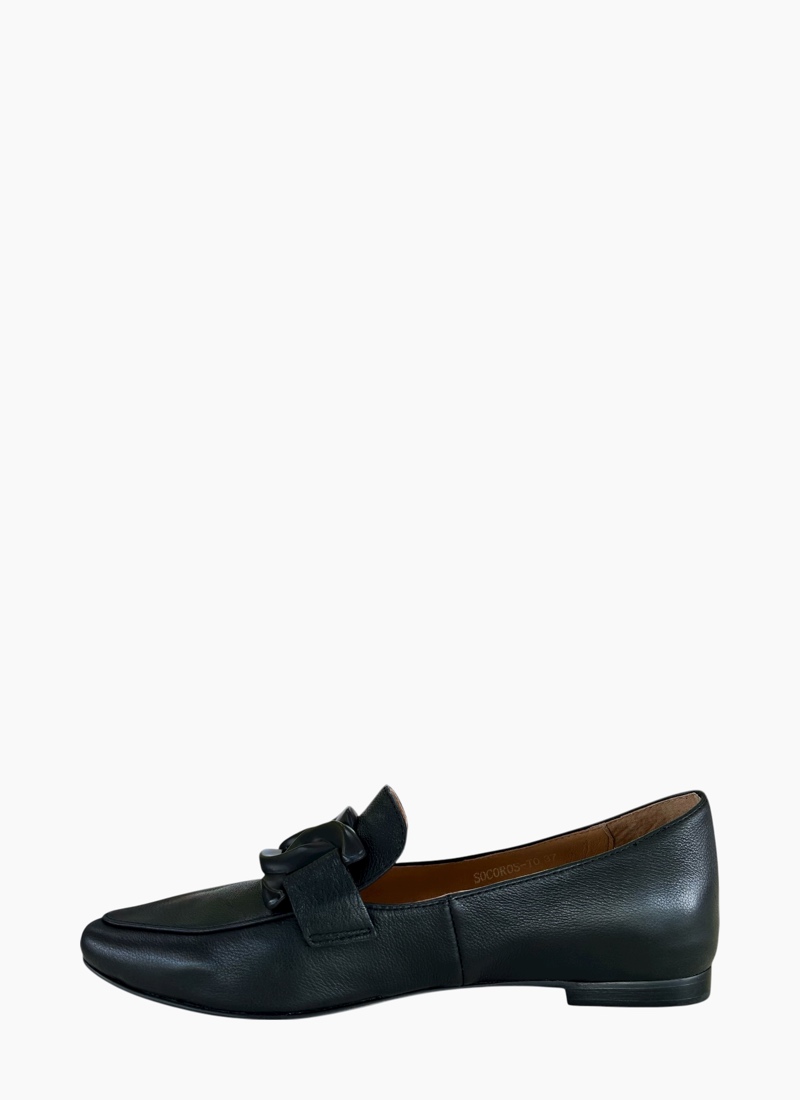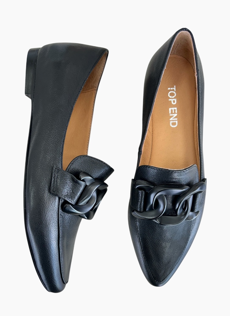 Introducing the Socoros Loafer Black from Top End. This refined black leather flat blends timeless elegance with a modern knotted detail for everyday polish.