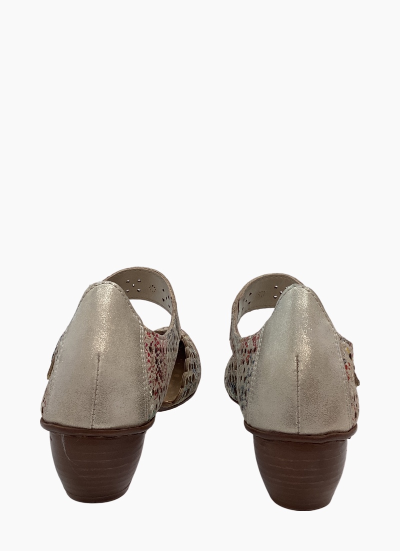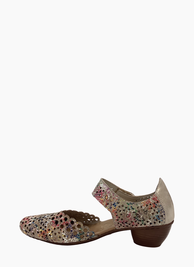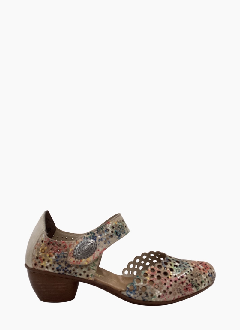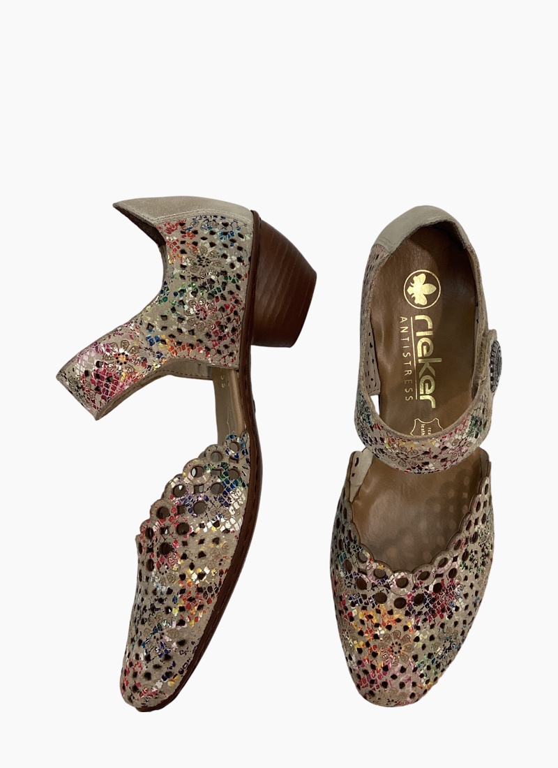 Introducing the Rieker 43753-91 — a charming low-heel shoe that blends comfort with decorative flair.