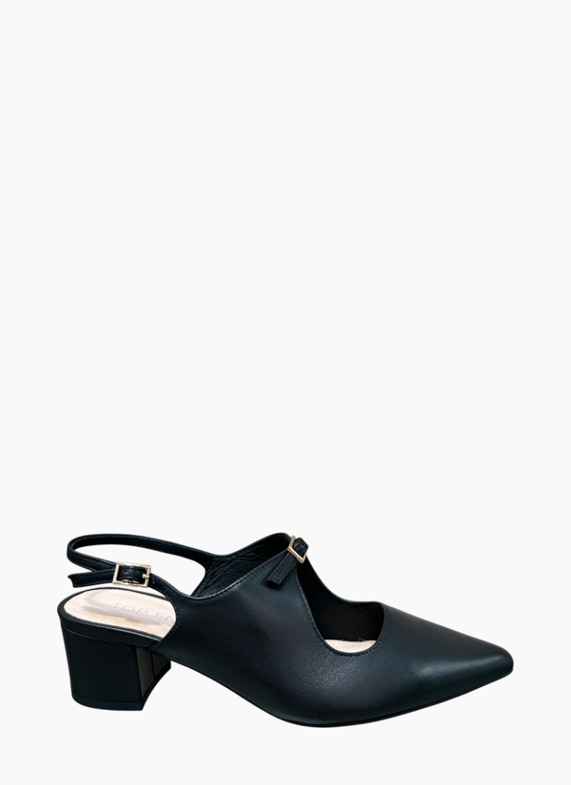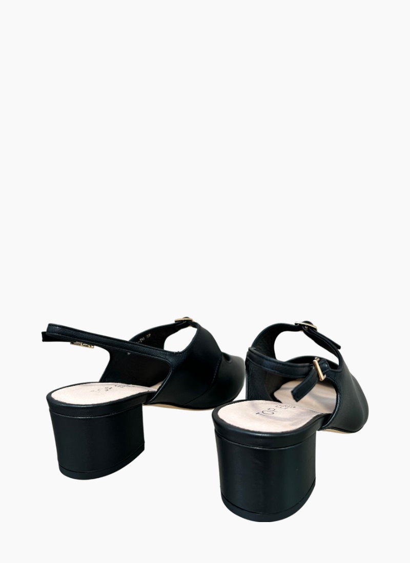 - Adjustable slingback strap with gold-tone buckle adds secure fit and subtle luxe detailing
