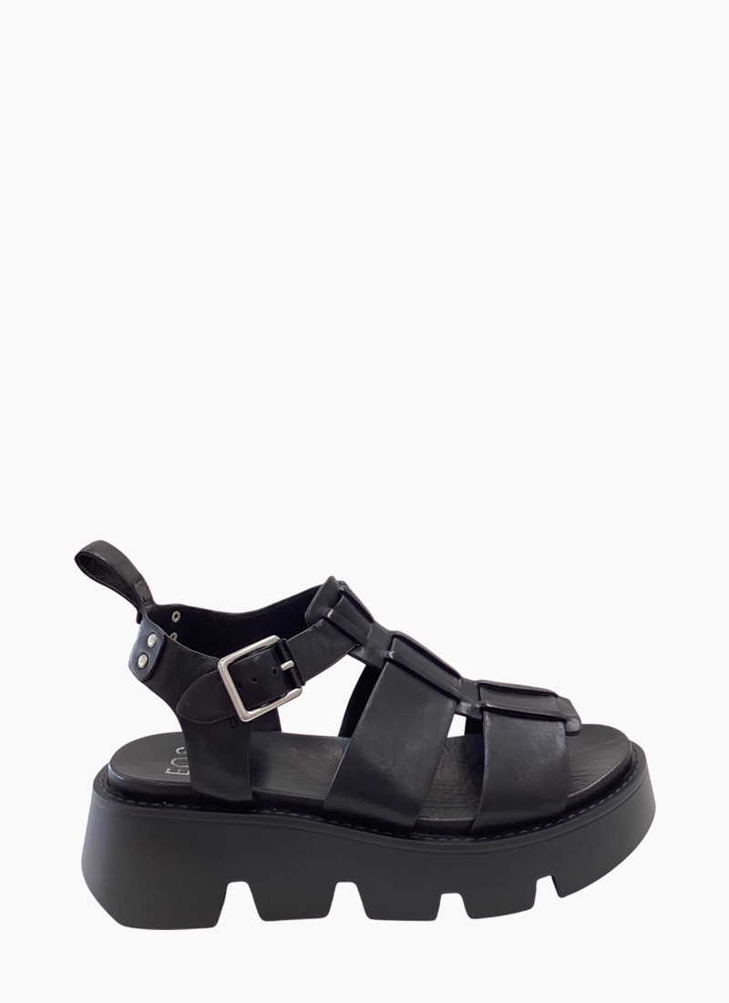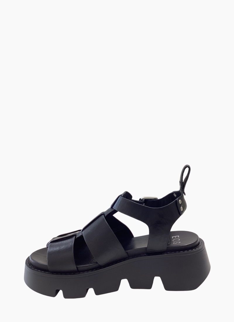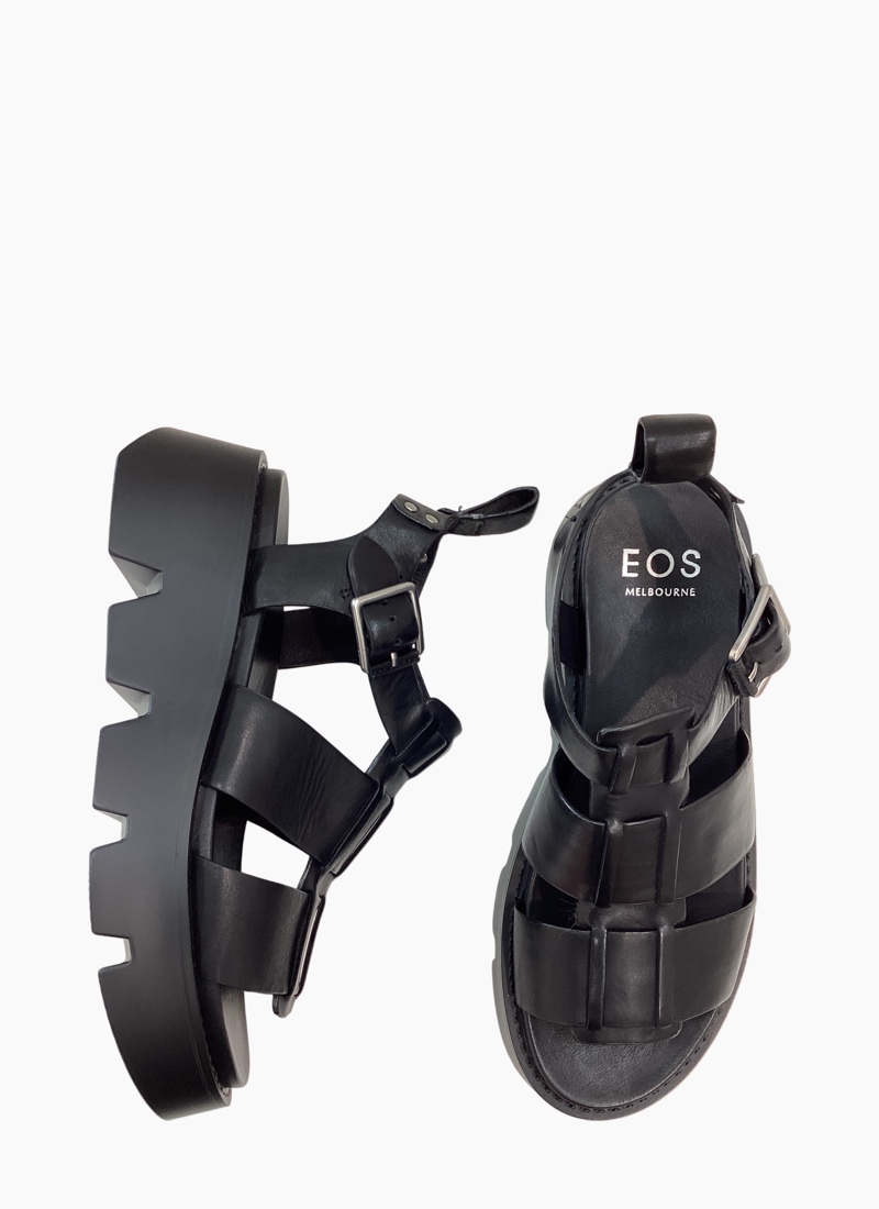 Introducing the Kailan Sandal from EOS. A bold, contemporary black sandal built on a chunky lug platform with smooth leather straps for statement-making everyday wear.