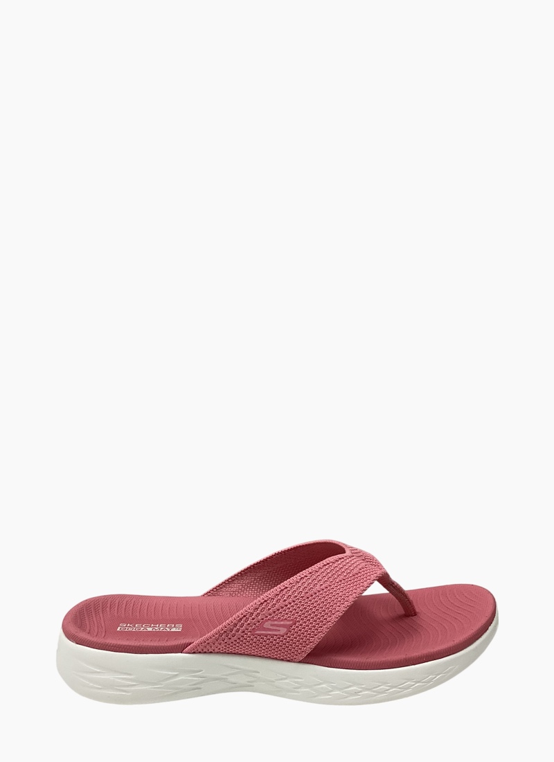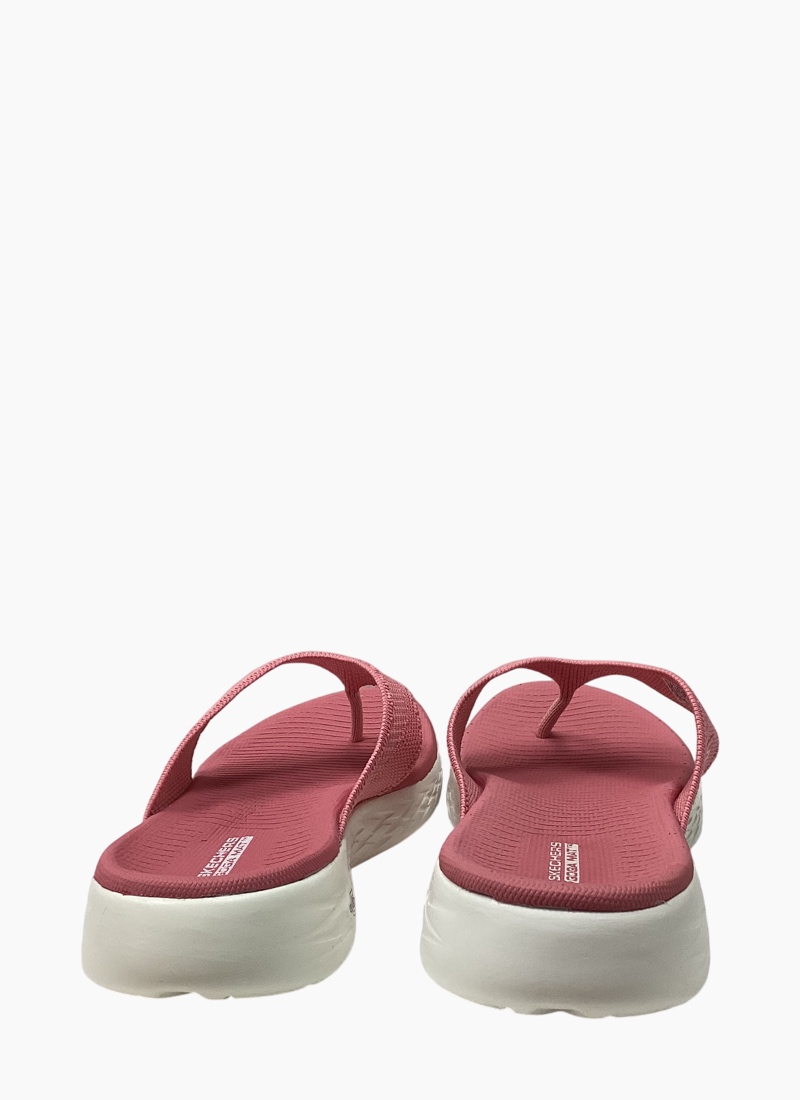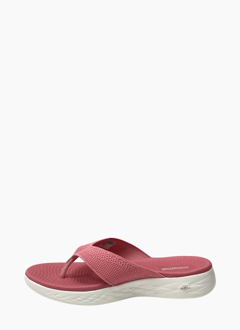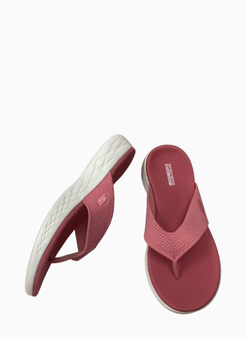 Walk with warm-weather style and comfort wearing Skechers On-the-GO® 600 - Flourish. This sporty 3-point thong sandal features a soft two-toned woven mesh upper, supportive contoured Goga Mat® footbed design and lightweight 5GEN® cushioning.