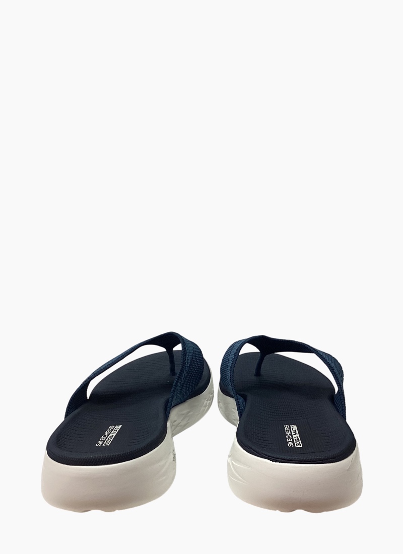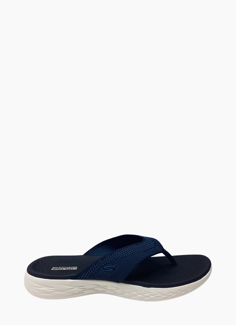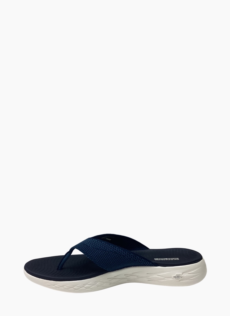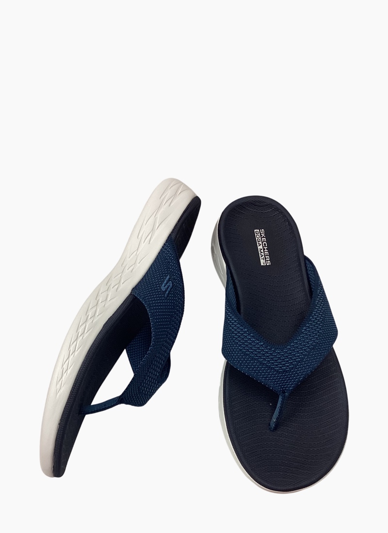 Walk with warm-weather style and comfort wearing Skechers On-the-GO® 600 - Flourish. This sporty 3-point thong sandal features a soft two-toned woven mesh upper, supportive contoured Goga Mat® footbed design and lightweight 5GEN® cushioning.