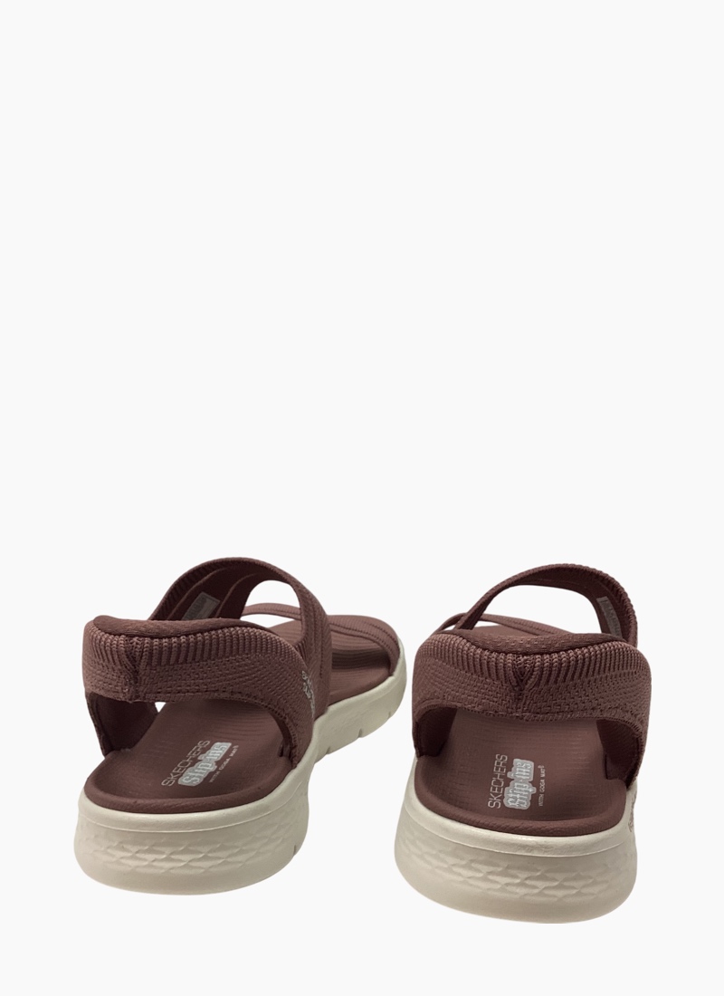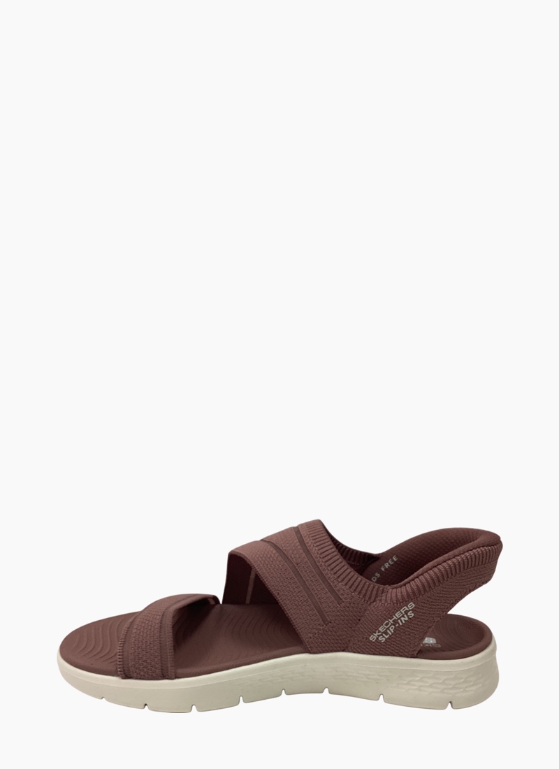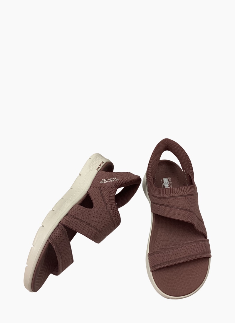 Experience an effortless way to wear your favorite sport sandal with Skechers Hands Free Slip-ins®: GO WALK Flex Sandal - Enticing. Designed with our Heel Pillow, this strappy slip-on sandal features a knitted upper with a Skechers Hands Free Slip-ins® back heel, contoured Goga Mat® footbed and lightweight ULTRA GO® cushioning.