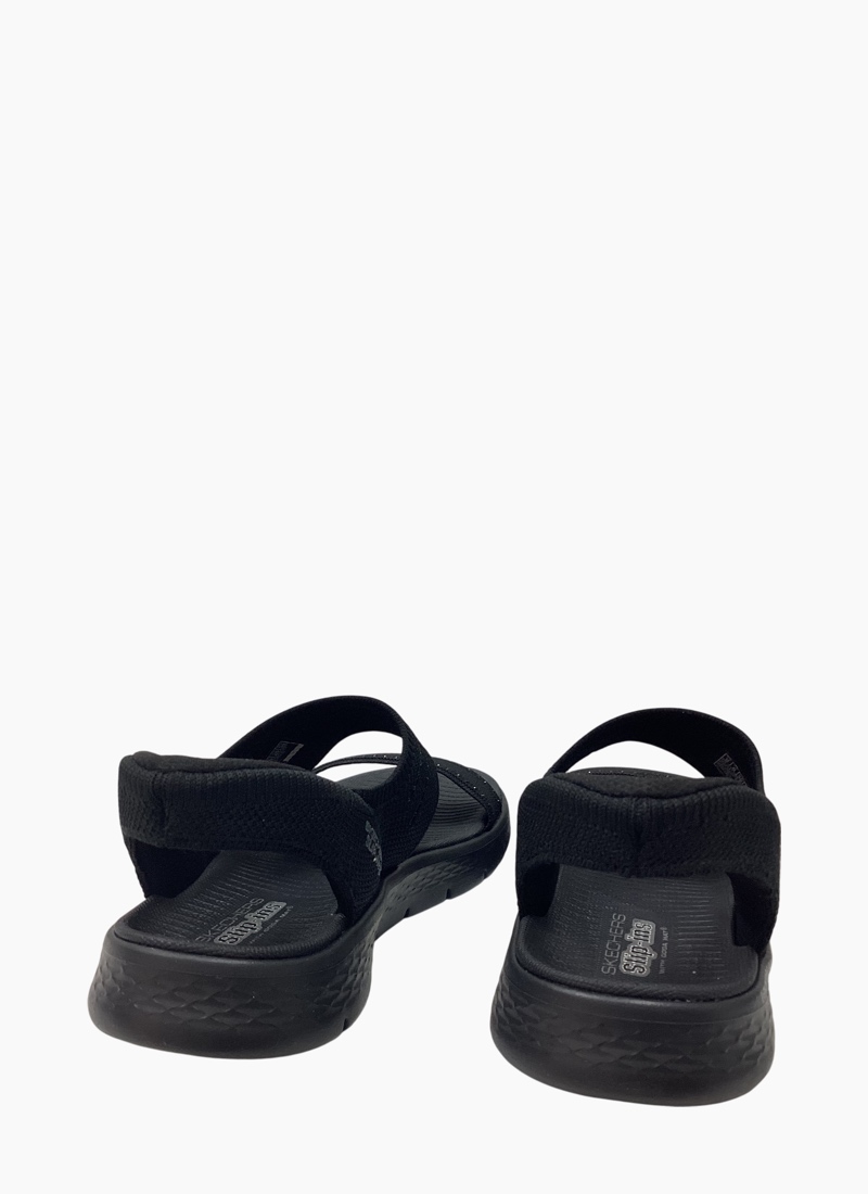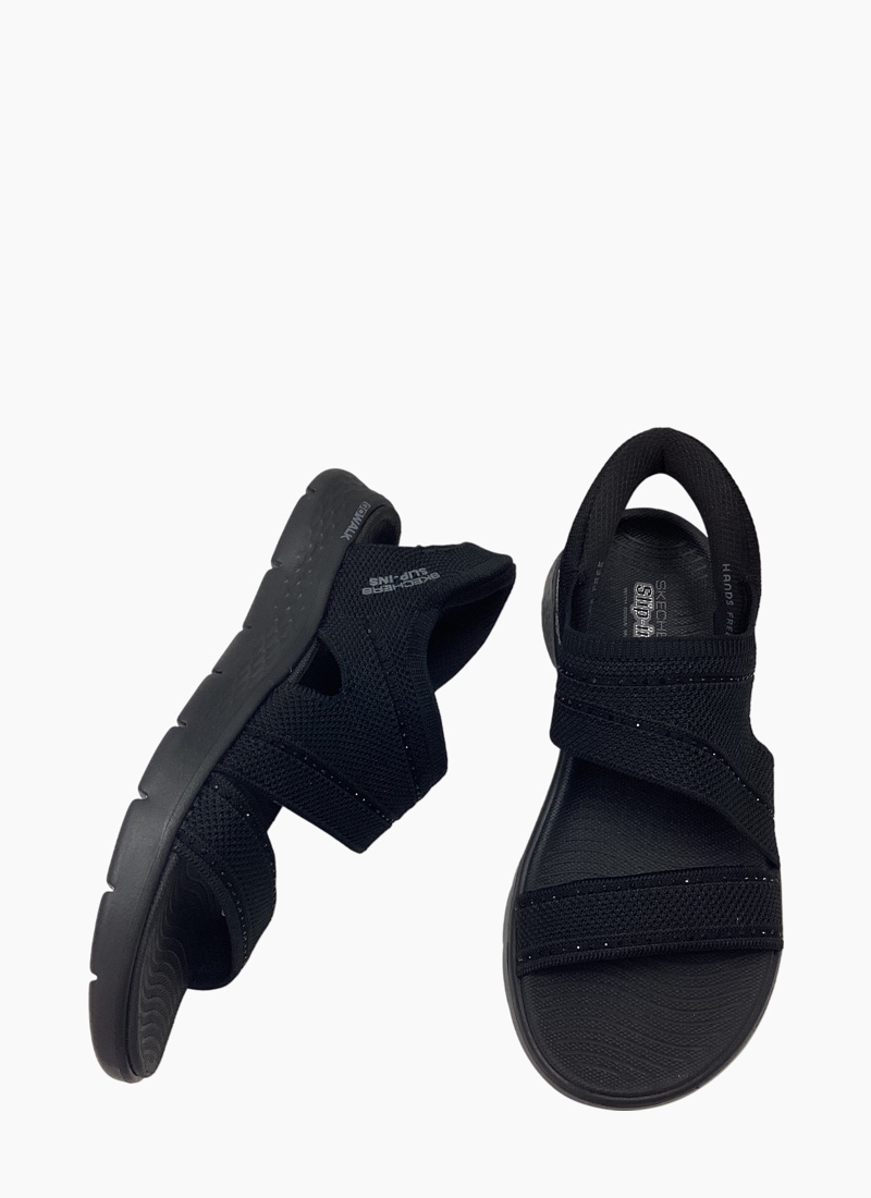 Experience an effortless way to wear your favorite sport sandal with Skechers Hands Free Slip-ins®: GO WALK Flex™ Sandal - Belle. Designed with our Heel Pillow®, this vegan slip-on sandal features an engineered knit upper with rhinestone detail, Skechers Hands Free Slip-ins® back heel, a contoured Goga Mat® footbed, and lightweight ULTRA GO® cushioning.