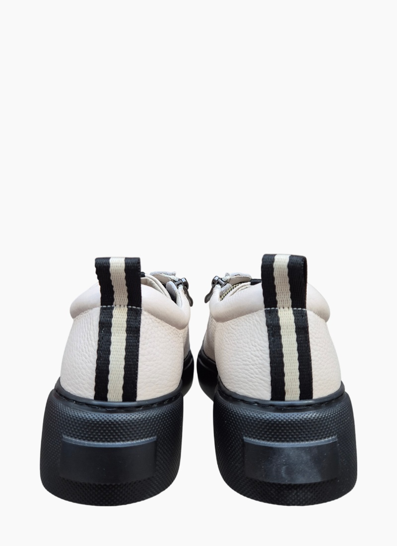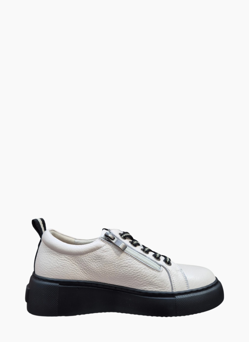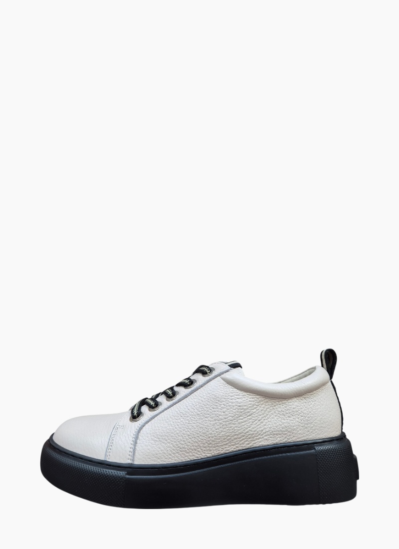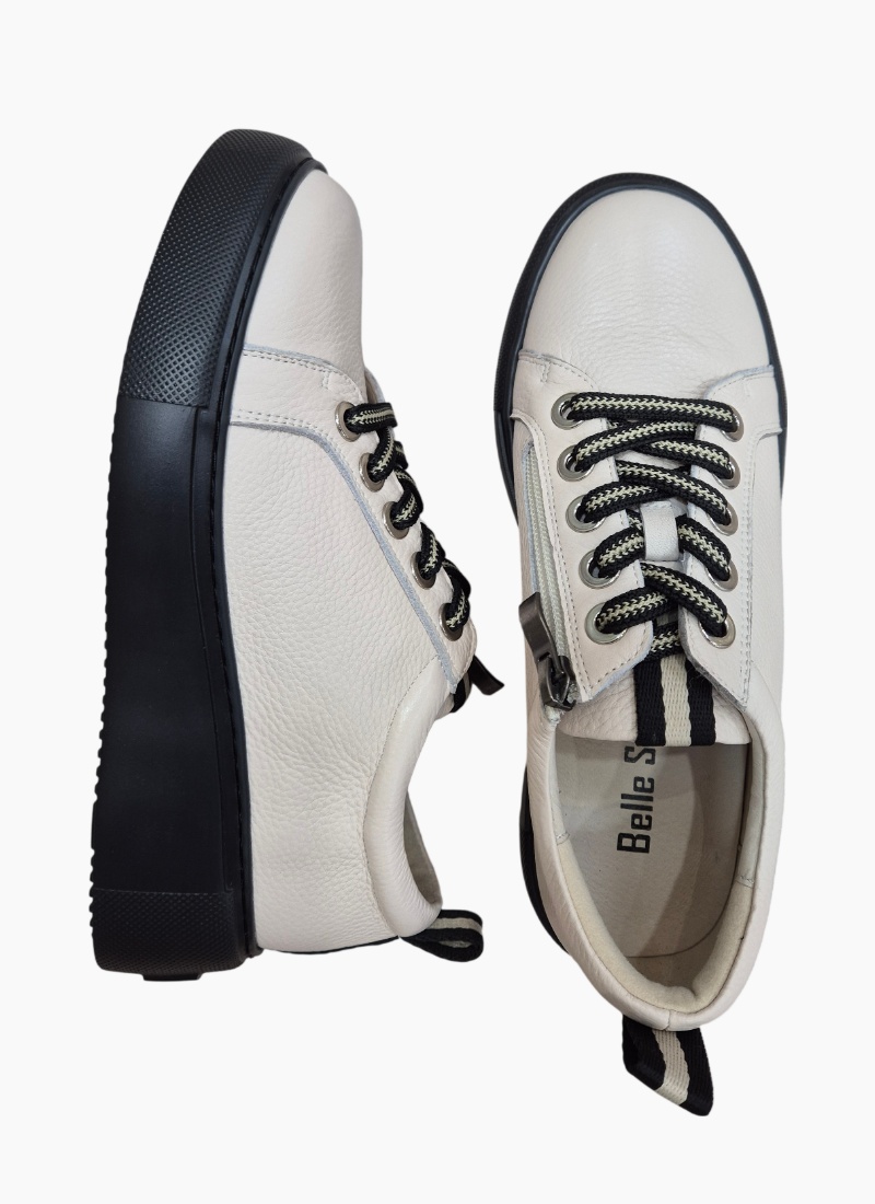 Introducing the Romney Sneaker Bone from Belle Scarpe. A contemporary sneaker crafted in bone pebbled leather with a striking black platform sole for modern polish.
