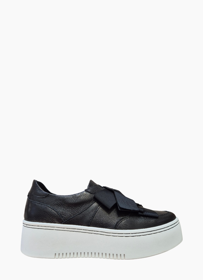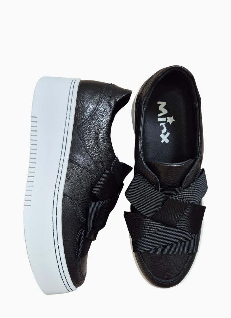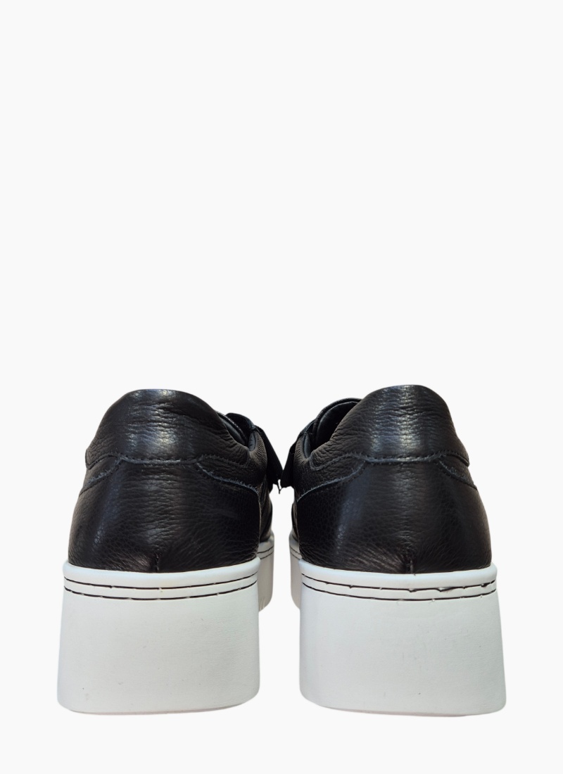 Introducing the Yoko Sneaker Black from Minx. A contemporary women's sneaker that pairs a pared-back black leather upper with a bold white 5cm platform sole for everyday polish.