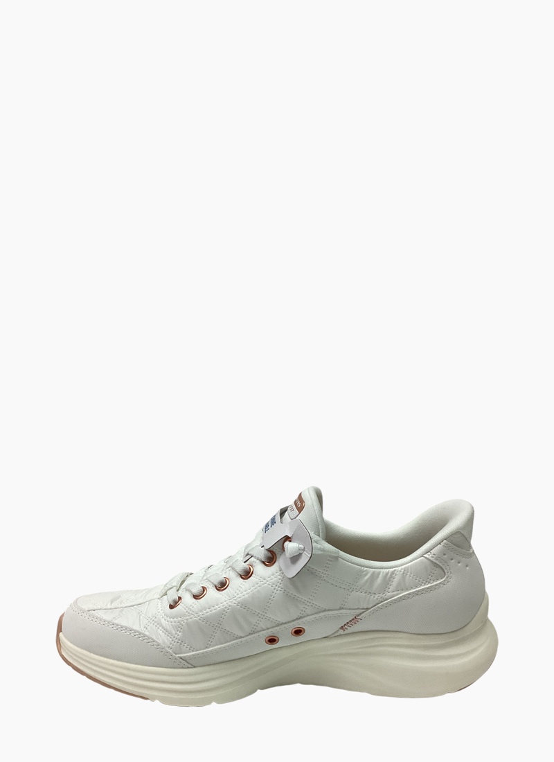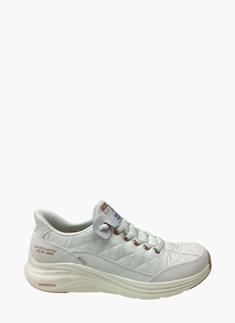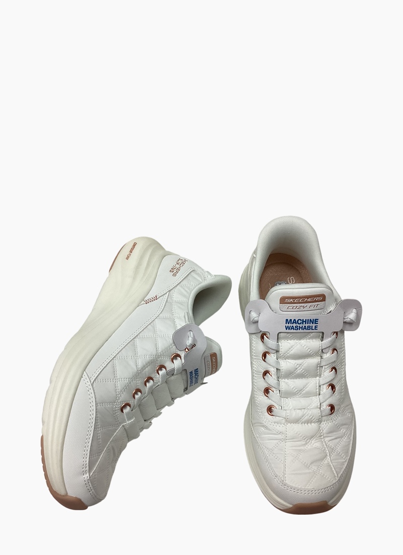 Step into plush luxury and cozy comfort with Skechers Hands Free Slip-ins®: Contour Foam™ - Cozy Fit® Golden Hour. Designed with our Heel Pillow®, this slip-on style features a quilted Cozy Fit® and duraleather overlay upper with tied-off stretch laces, Contour Foam™ midsole cushioning, and our signature cushioned Skechers Air-Cooled Memory Foam® insole.