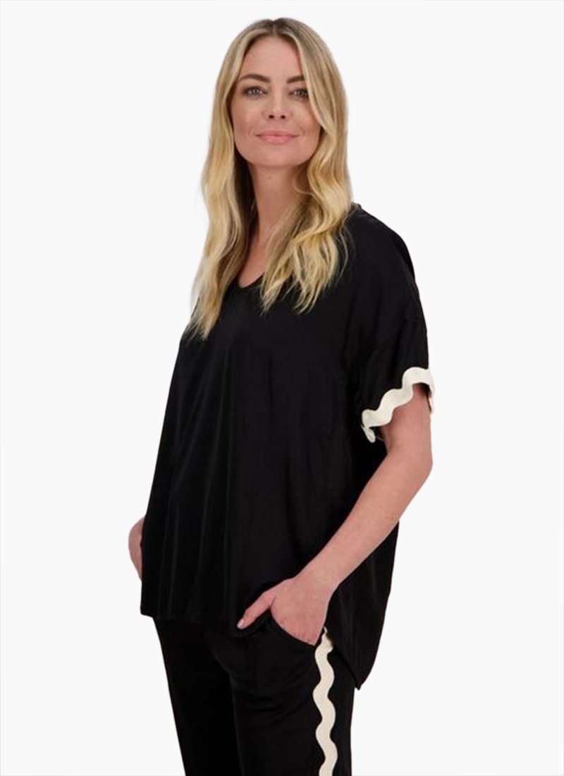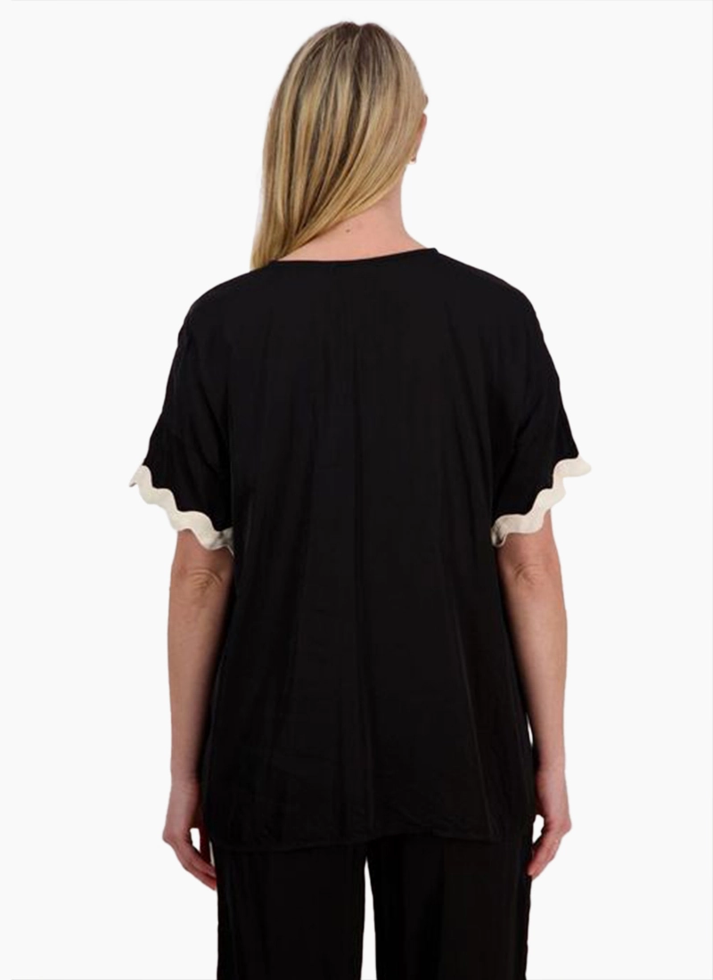 - Short sleeves- Soft V neck- Cotton rikrak around the sleeves- Longer at the back- Shaped hem