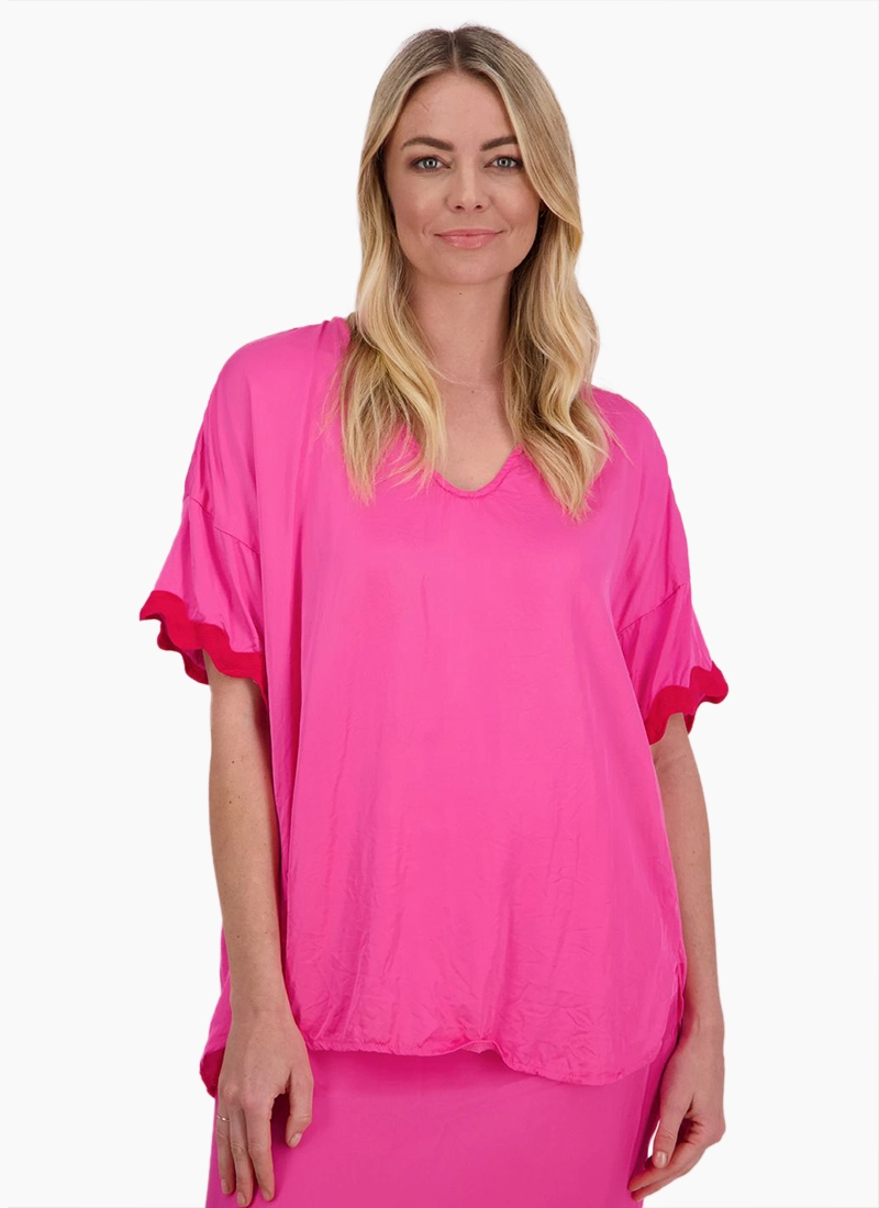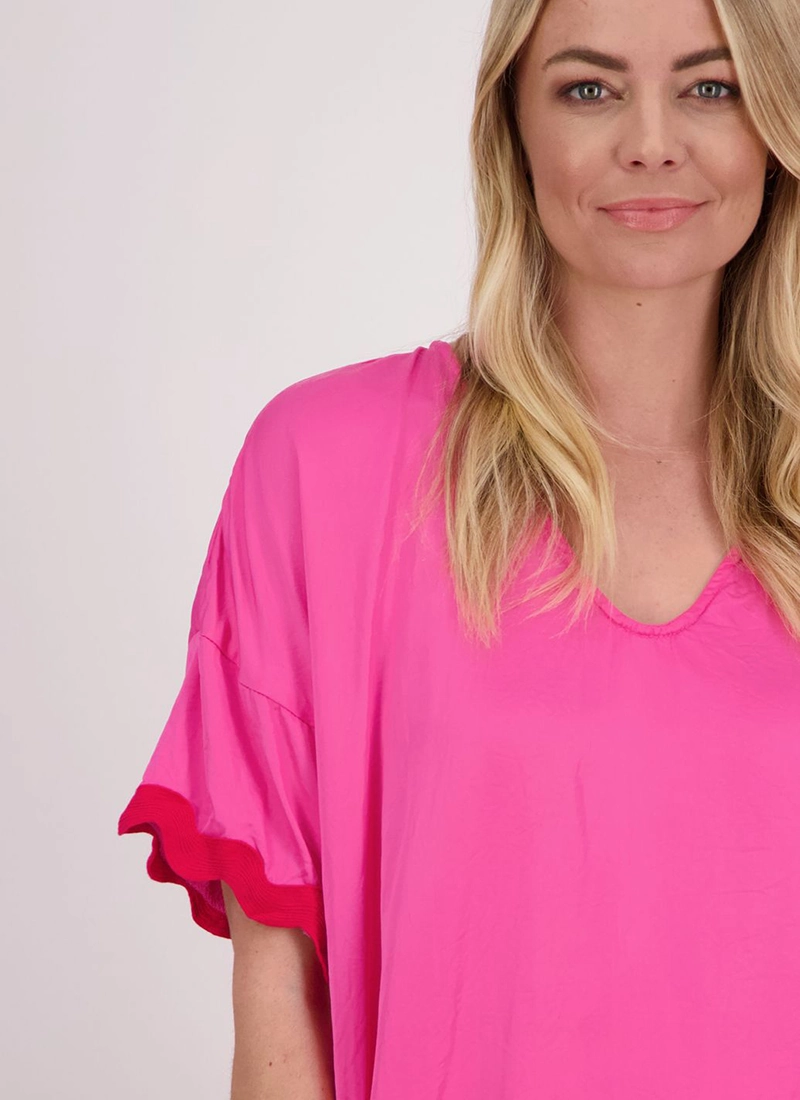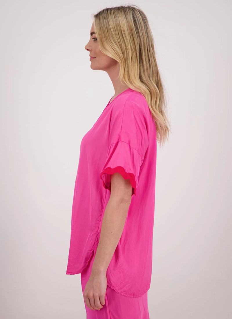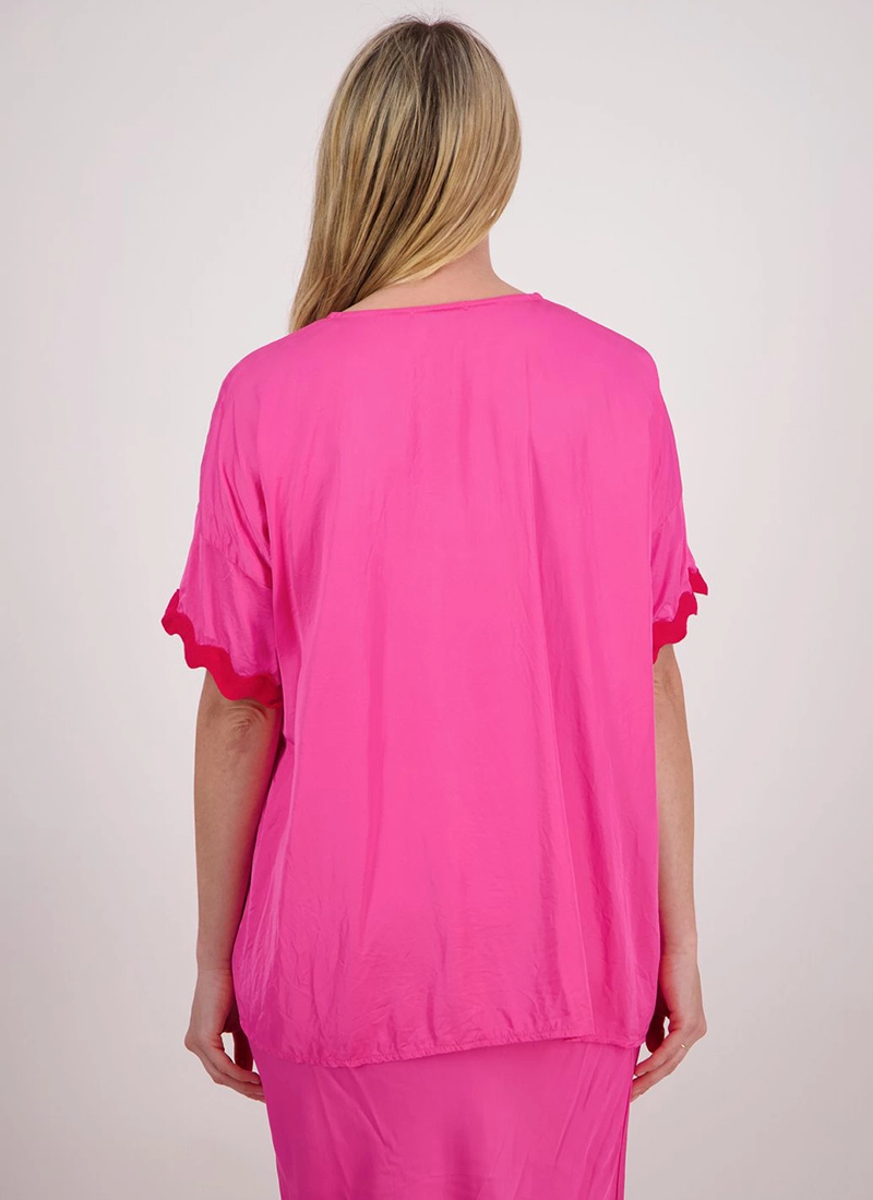 - Short sleeves- Soft V neck- Cotton rikrak around the sleeves- Longer at the back- Shaped hem