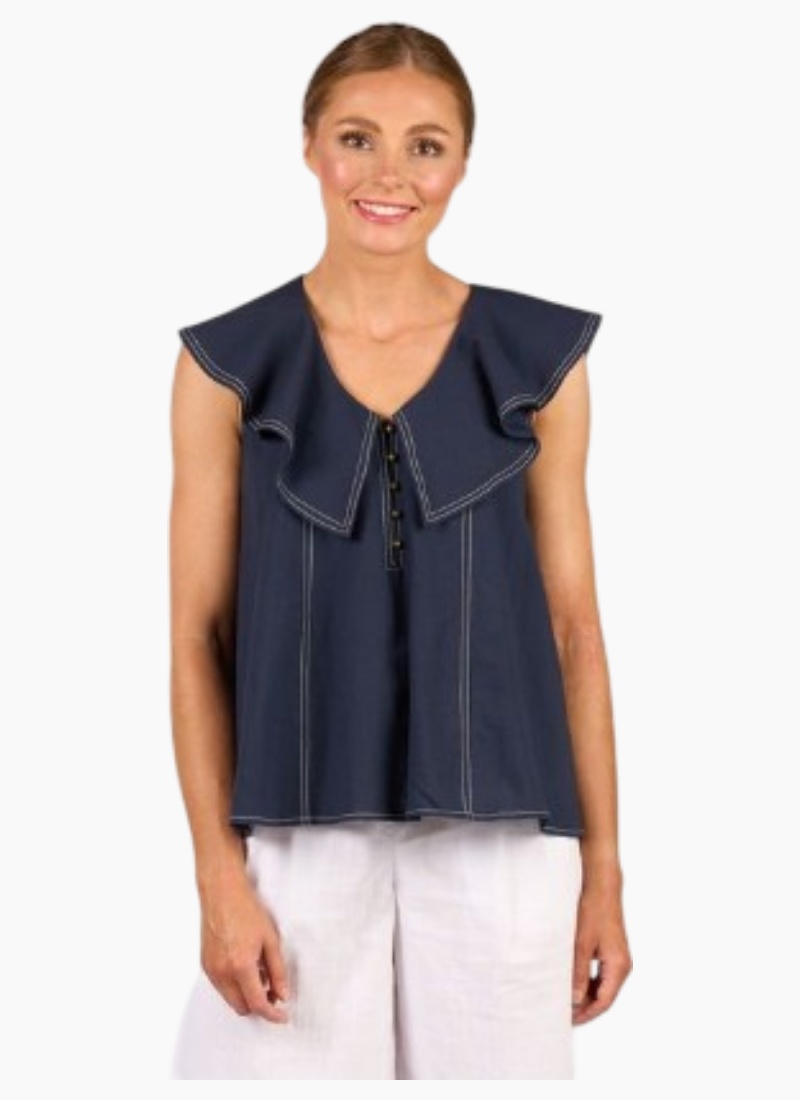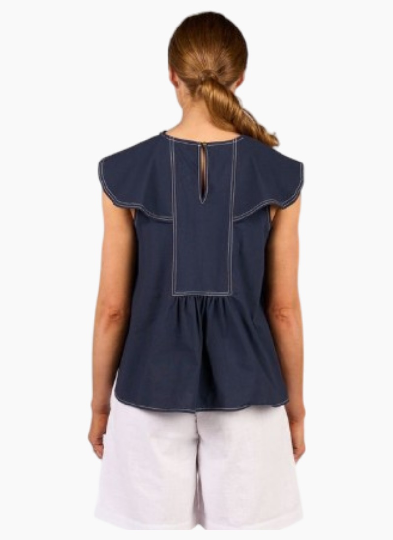 The Breeze Top in ink features crisp white contrast stitching that highlights its unique construction. Made from a lightweight cotton with a linen look, it has a wide bib collar that softens into cap-like shoulders before gathering into the back for a relaxed, sculptural shape.Great teamed back with white pants or your denim.