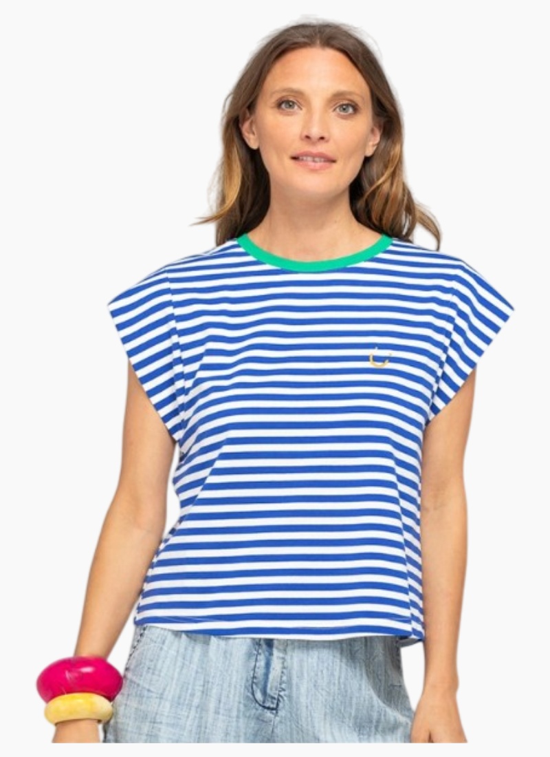 The Boom Shankar Bellissimo Tee is a colourful take on your classic summer t-shirt. Cerulean blue meets crisp white stripes in a fresh tee design with contrast SMILE embroidery.100% cotton, round neck, contrast neck band, contrast SMILE embroidery, cap sleeve with side panel.