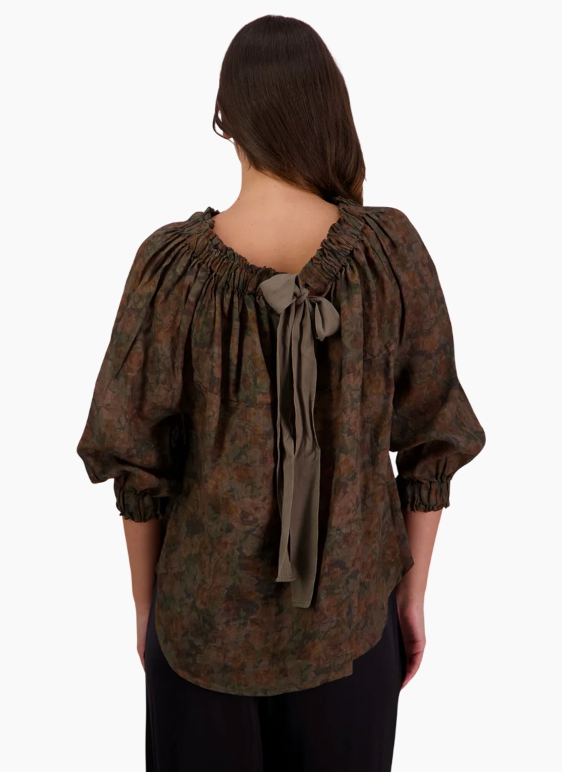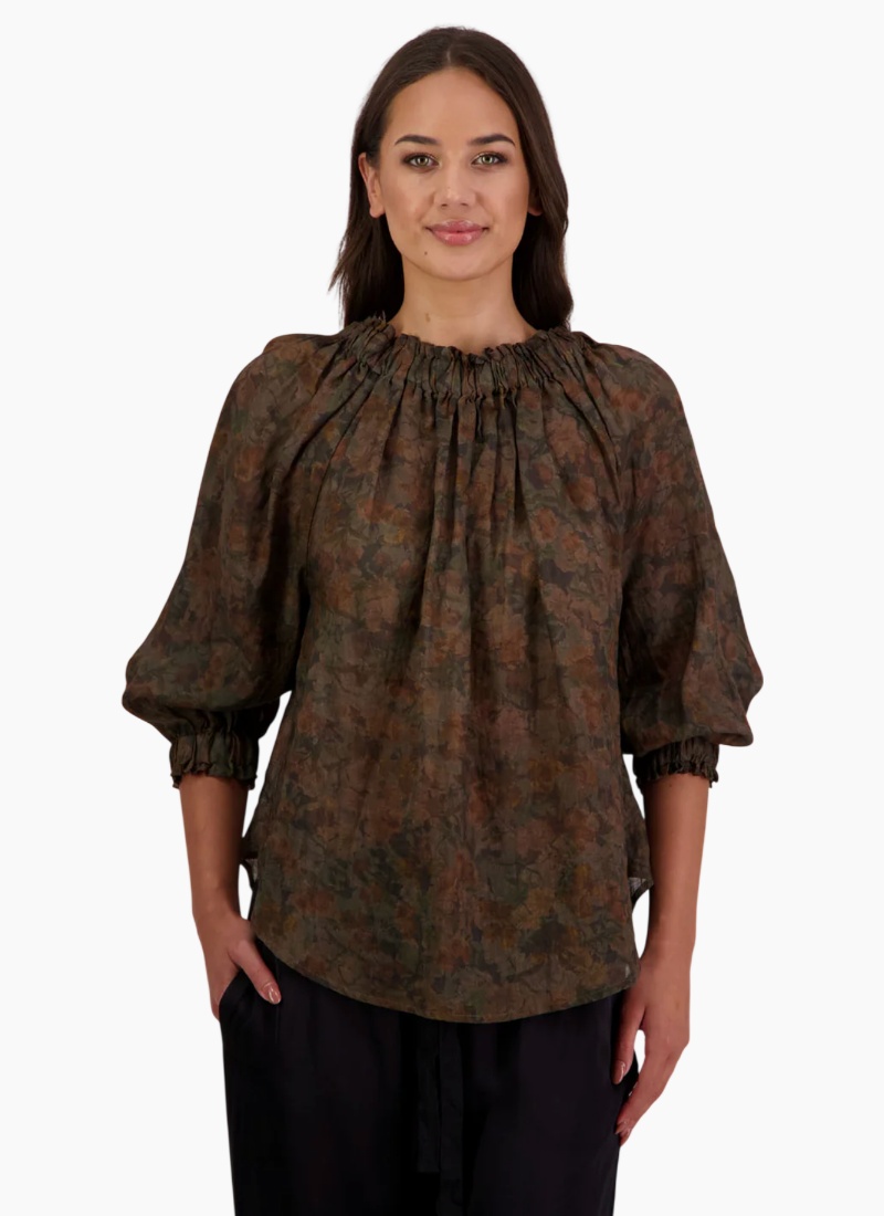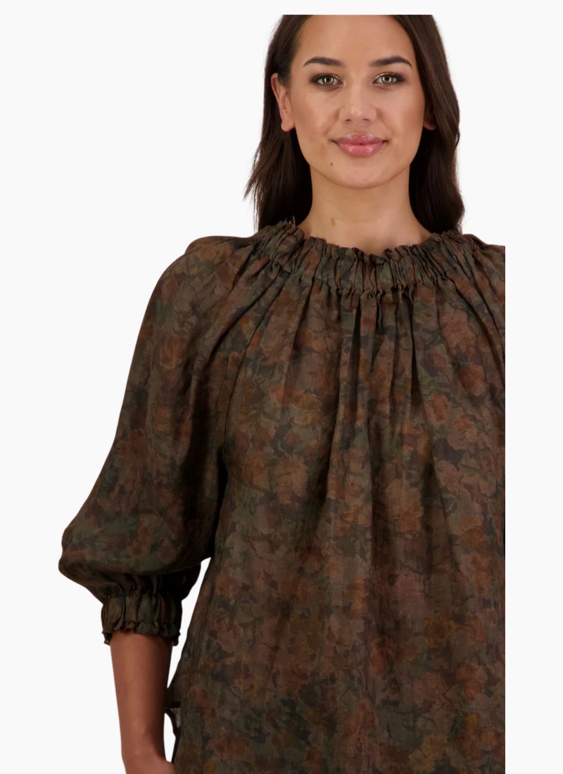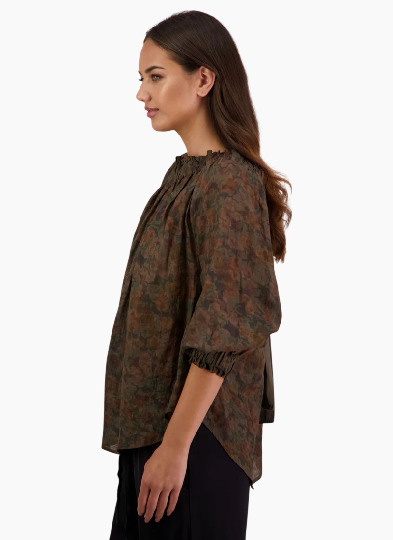 - A Blouse in deep olive green vintage floral with a gathered ruffle neckline and subtle pleating at the yoke