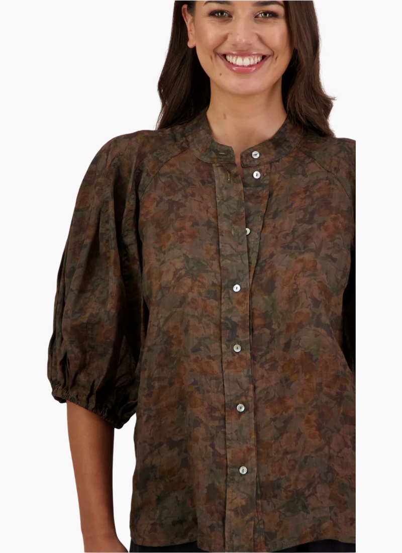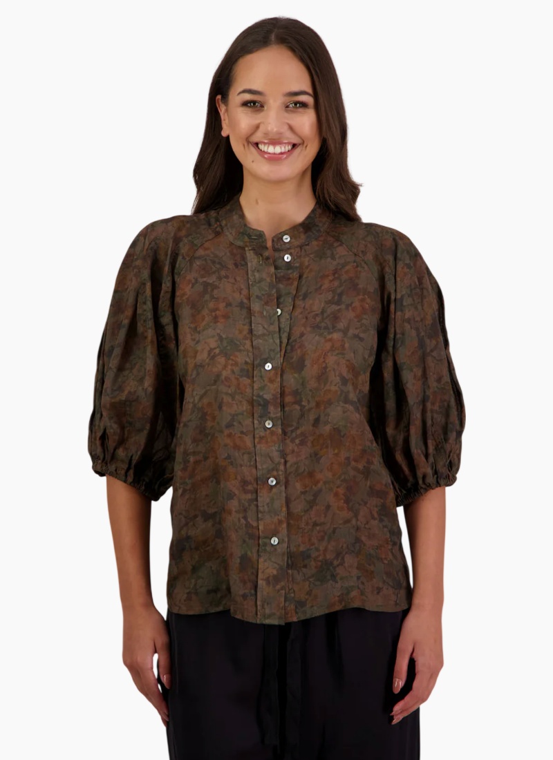 Introducing the Harlow Blouse Vintage Floral from Briarwood. This vintage-inspired blouse features a muted olive floral colourway and a soft viscose drape for effortless comfort and polish.