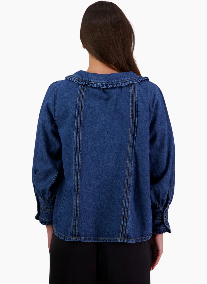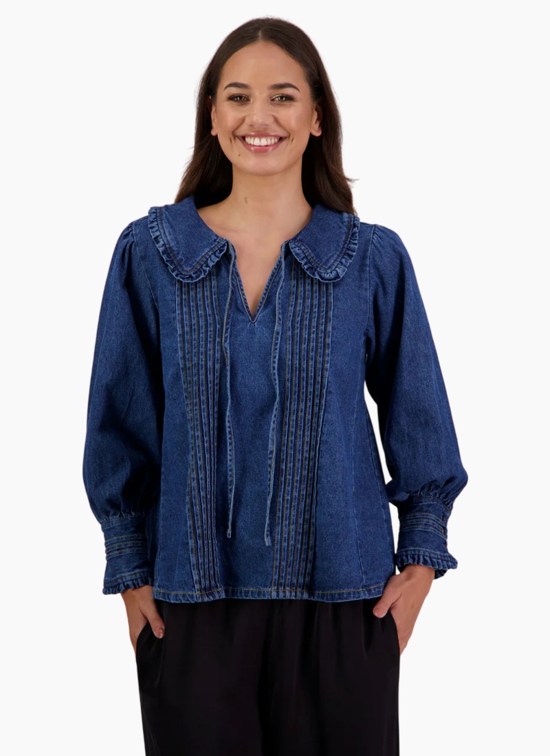 Introducing the Redmond Denim Top from Briarwood. A beautifully detailed denim blouse that pairs vintage-inspired charm with modern everyday ease.